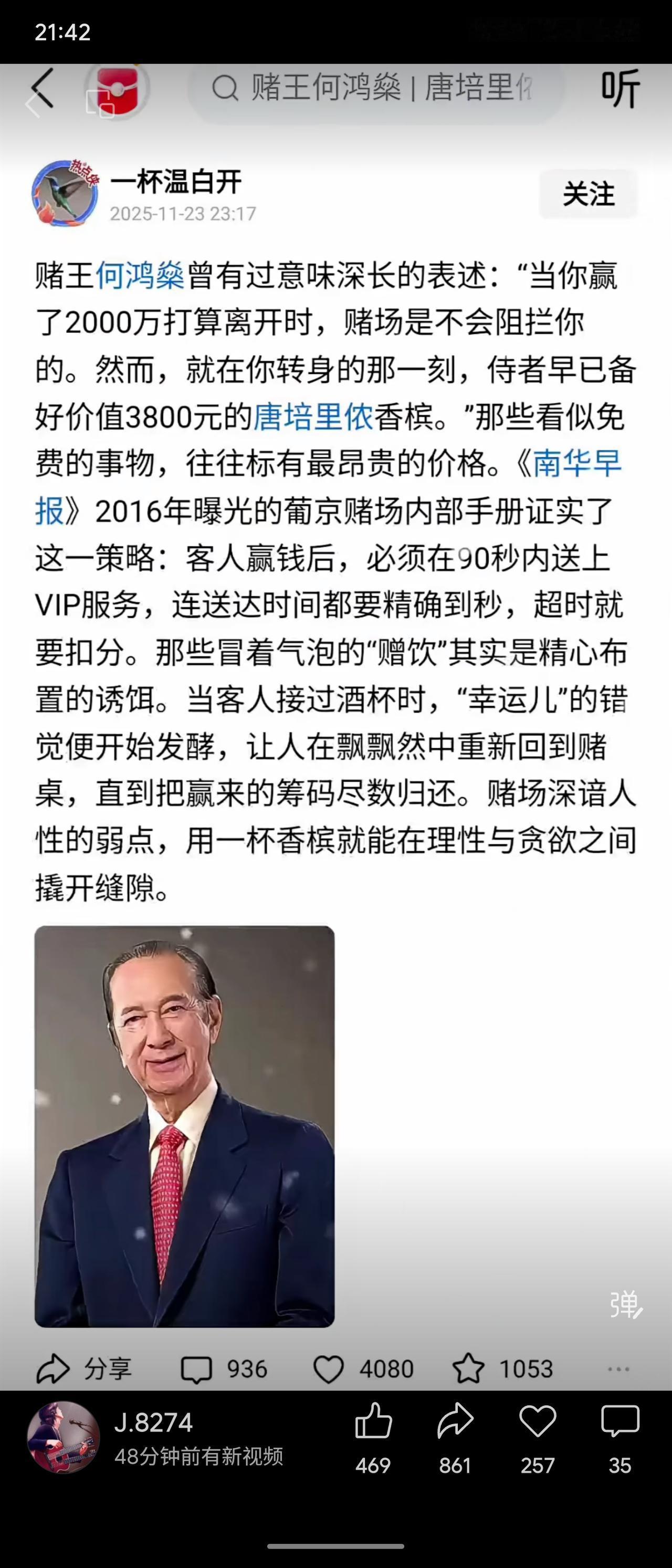 赌王何鸿燊揭示赌场策略:客人赢大额后,赌场会立即送上昂贵香槟,营造“幸运”错觉以诱使其继续赌博。内部手册要求服务须在90秒内精准送达。这免费赠饮实为高价诱饵,旨在利用人性贪念,让赢家最终输回所有。