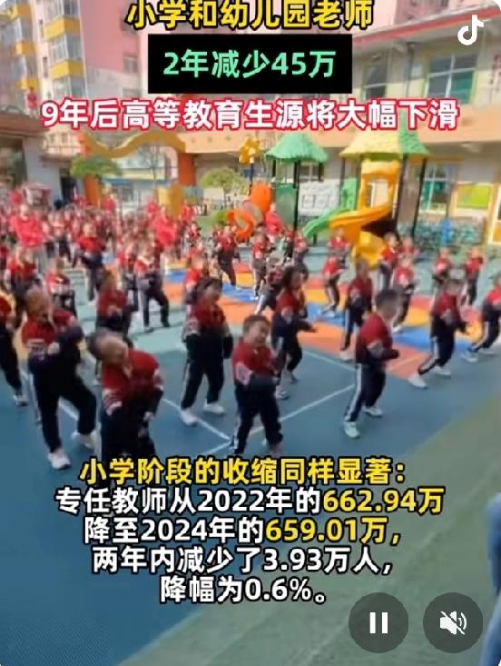教育界最近正掀起一场大变动! 小学和幼儿园老师两年少了45万!这背后到底藏着哪些主要原因呢? 最新的统计数据表明,幼儿园老师在两年里一下子少了41万,小学老师也少了将近4万。师范院校急得不行,纷纷改名叫“大学”来想办法自救,近四分之一的院校在三年里新增了3个工科专业。人工智能、机器人工程成了热门,传统的师范专业却越来越不受欢迎了! 更让人担心的是,2025年就已经有本科院校招不够学生了。有专家预测,到2039年之后,高校的生源数量会暴跌41%,这就好比10个学生里,会少掉4个!厦门大学的一位教授直接说,有些高校可能会直接关门。 这场教育界的“寒冬”来得比大家想的还要快。幼儿园关门的潮还没过去,大学倒闭的潮又要来了?当1062万的“超低人口队列”碰上1786万的学位缺口,咱们的孩子以后会不会遇到“上学不难反而容易”的反转情况呢?