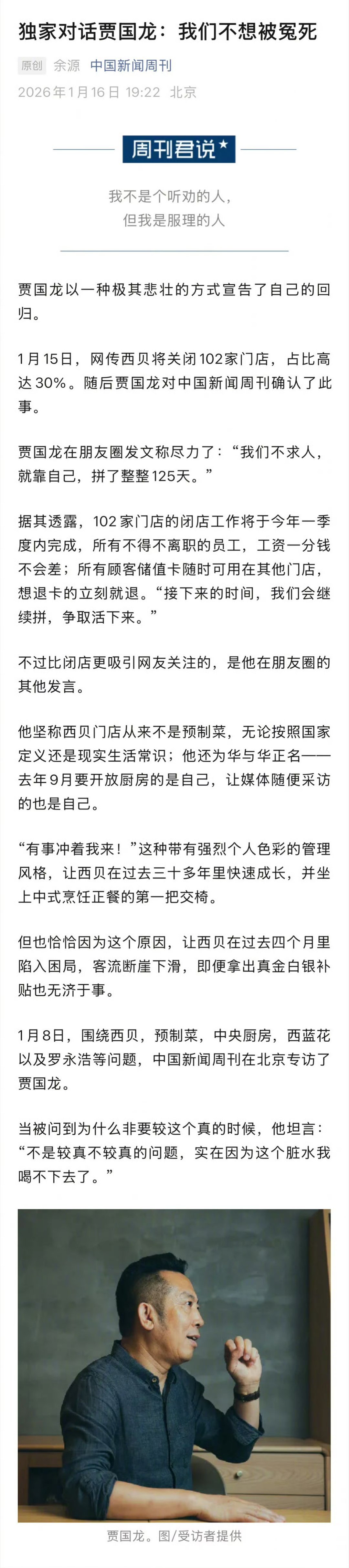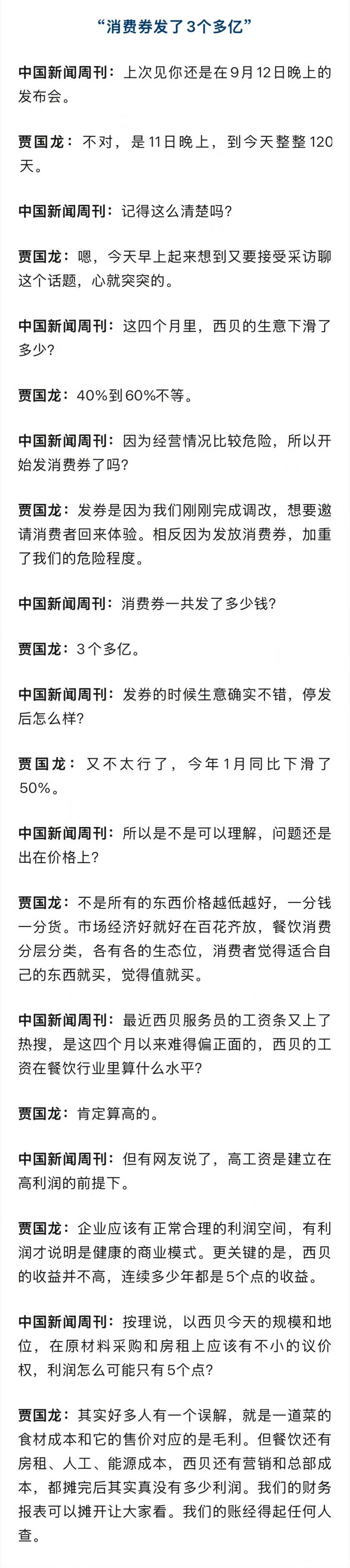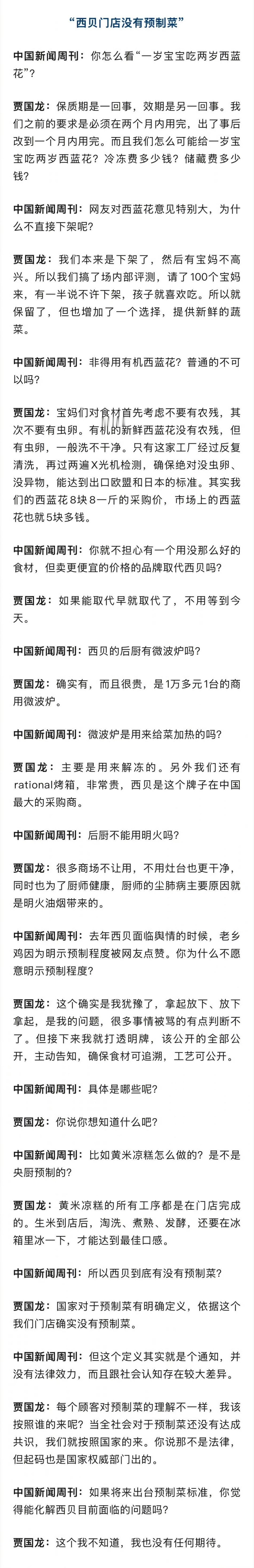 贾国龙回应一岁宝宝吃两岁西蓝花 中国新闻周刊能够站出来发声,这多少代表了一种官方的态度。官方媒体在网络名人争斗中很少出来站台,这次是个例外,估计这也是西贝的底气,所以贾国龙直接出面硬刚罗永浩。目前两人都被禁言,只有通过官方媒体发声争取支持者,就看罗永浩怎么应对了。