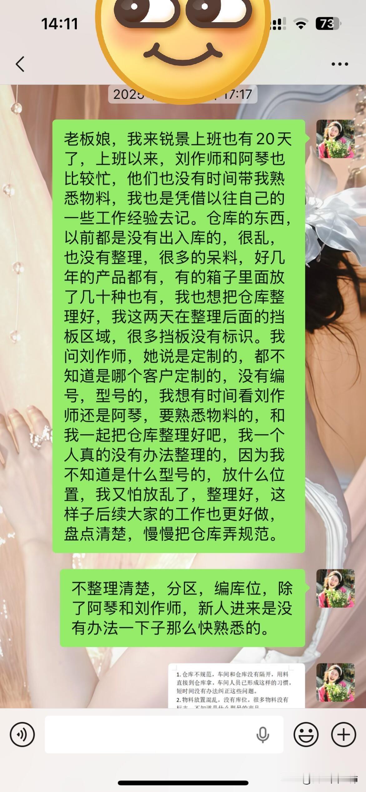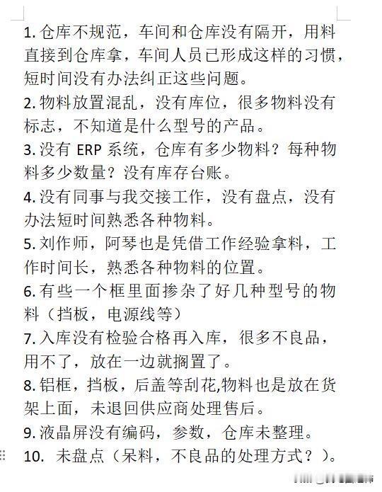 做仓管的第27天,之前是做跟单的,也做过仓库文员,年底工作不好找,随便找了一份工作做仓管。这份工作离我现在住的地方2公里,底薪5.5k,加班有加班费,月休四天,也不严格,所以做了快一个月了。 入职进来,没有人和我交接工作,没有人带我,告诉我这是什么产品,用于什么的,有一个人是老板表弟,他带我捡料,捡的时候就说这是触摸线……然后没有了,没有告诉我其他的有什么是通用的,仓库没有盘点过,到处都是乱七八糟,没有标识卡,没有出入库,在我进来做的前几天公司开始用管家婆系统,要采购入库,然后也没有人教我系统怎么用,完全凭借自己的工作经验,入库打单,东西都是没有出库的,没有库位,他们是做了十多年了,凭经验拿东西。 老板说要整理仓库,我一个人肯定是整理不来,他们又不整,我每天都很内耗,坚持做到这个月底吧,根本整不好,他们拿东西都是想拿就拿,多的坏的直接扔仓库,也没有写款号尺寸,头皮发麻,仓库起码几十箱东西,里面各种各样的物料都有,好的坏的,也没有质检入库,坏的就丢一边,流程也不规范,也不教我,想要我快点上手,我也不是神仙啊。 他们也是很随便的,没有下决心想整理好,我天天看着也很头痛,有没有大神指点迷津。 (有时候物料找不到了,他们是在犄角旮旯里面拿出来的,我很震惊🤯,还让我快点学,我真的无语到了)