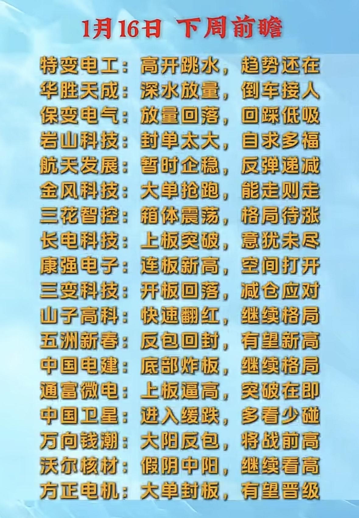 下周前瞻:股市热点与趋势分析 "特变电工趋势稳,华胜天成深水吸。保变回踩可低吸,岩山封单需谨慎。航天反弹渐弱,金风逢高宜出。三花震荡待涨,长电突破强势。康强连板空间开,三变回落要减仓。山子翻红格局持,五洲反包看新高。电建炸板仍可守,通富逼空突破近。卫星缓跌宜观望,万向反包战前高。沃尔假阴继续涨,方正封板望晋级。"