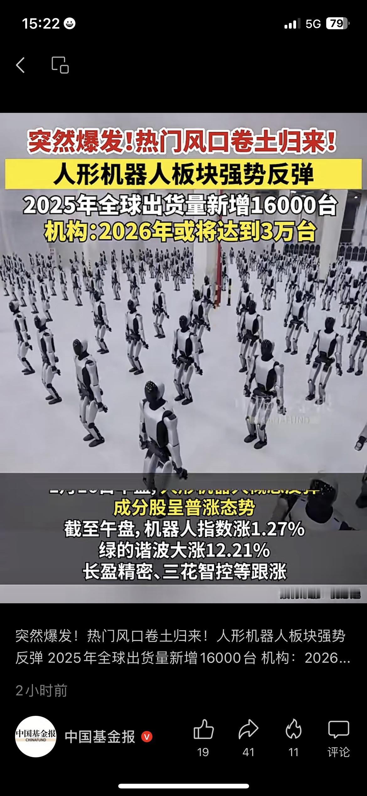 人形机器人板块突然爆了!2025年全球出货量新增16000台,机构预测2026年将达3万台,绿的谐波大涨12.21%,长盈精密、三花智控跟涨,这波风口你抓住了吗? 身边老股民去年买了机器人ETF,现在浮盈20%,他说这不是炒概念,是真有销量支撑,特斯拉、优必选都在量产,行业拐点来了人形机器人不是玩具,是下一个万亿级赛道。 你觉得这波行情能持续吗?会布局机器人相关股票或ETF吗? 人形机器人 A股 ETF定投 科技风口机器人股