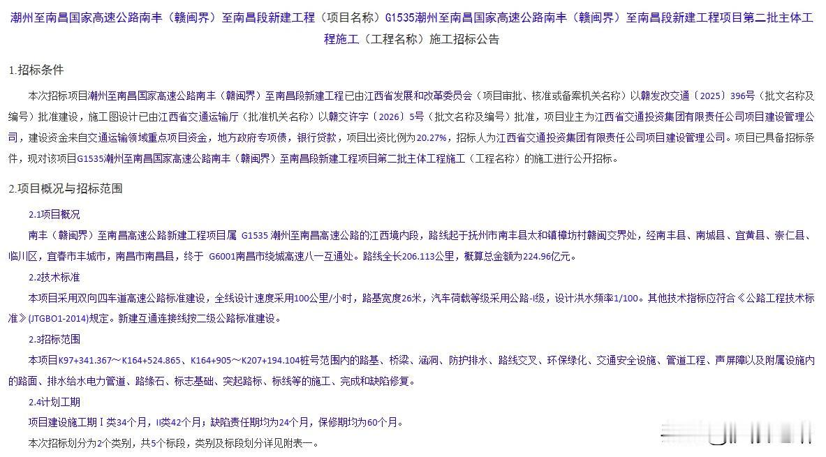 江西南昌至南丰高速公路新进展,新建工程项目第二批主体工程施工招标公告发布 还