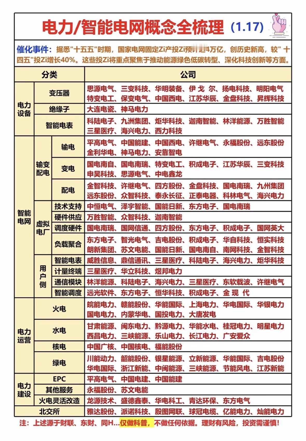 电力/智能电网概念全梳理,投资机会一览! "电力板块迎政策利好,智能电网、绿电、储能等细分领域龙头梳理,投资需谨慎。" "电力板块迎政策利好,智能电网、绿电、储能概念股全梳理,关注核心企业布局机会。"