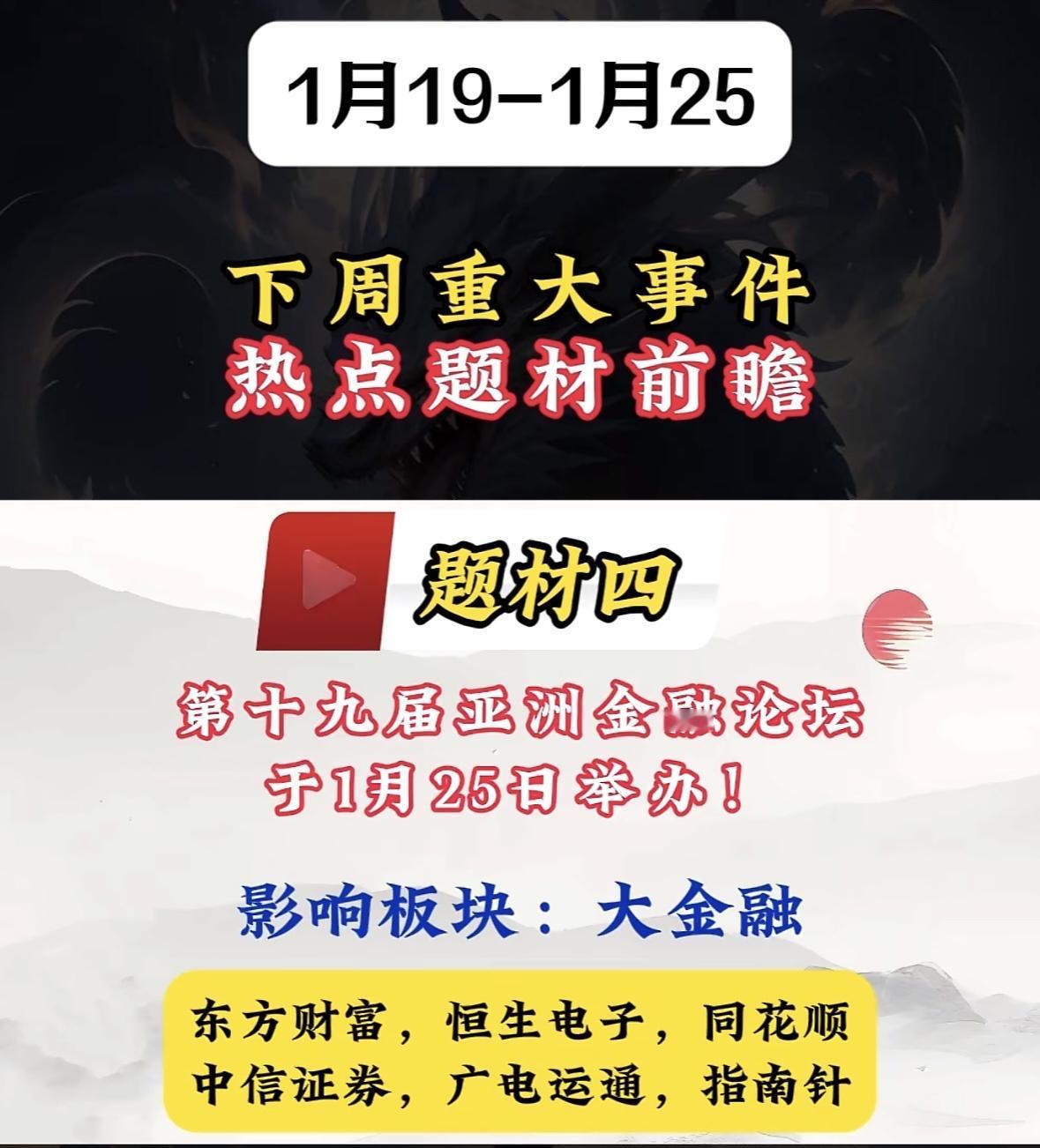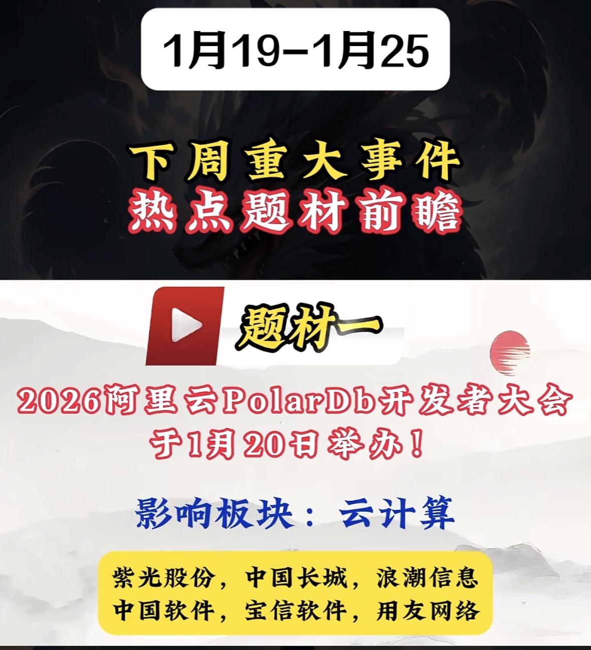 1月25日,第十九届亚洲金融论坛,大金融板块强势来袭! "阿里云开发者大会引爆云计算板块,紫光、浪潮等龙头受关注,科技赛道下周迎风口!" 下周云计算迎重磅大会,紫光、浪潮等龙头或受提振,开发者聚焦前沿技术,板块热度有望攀升。