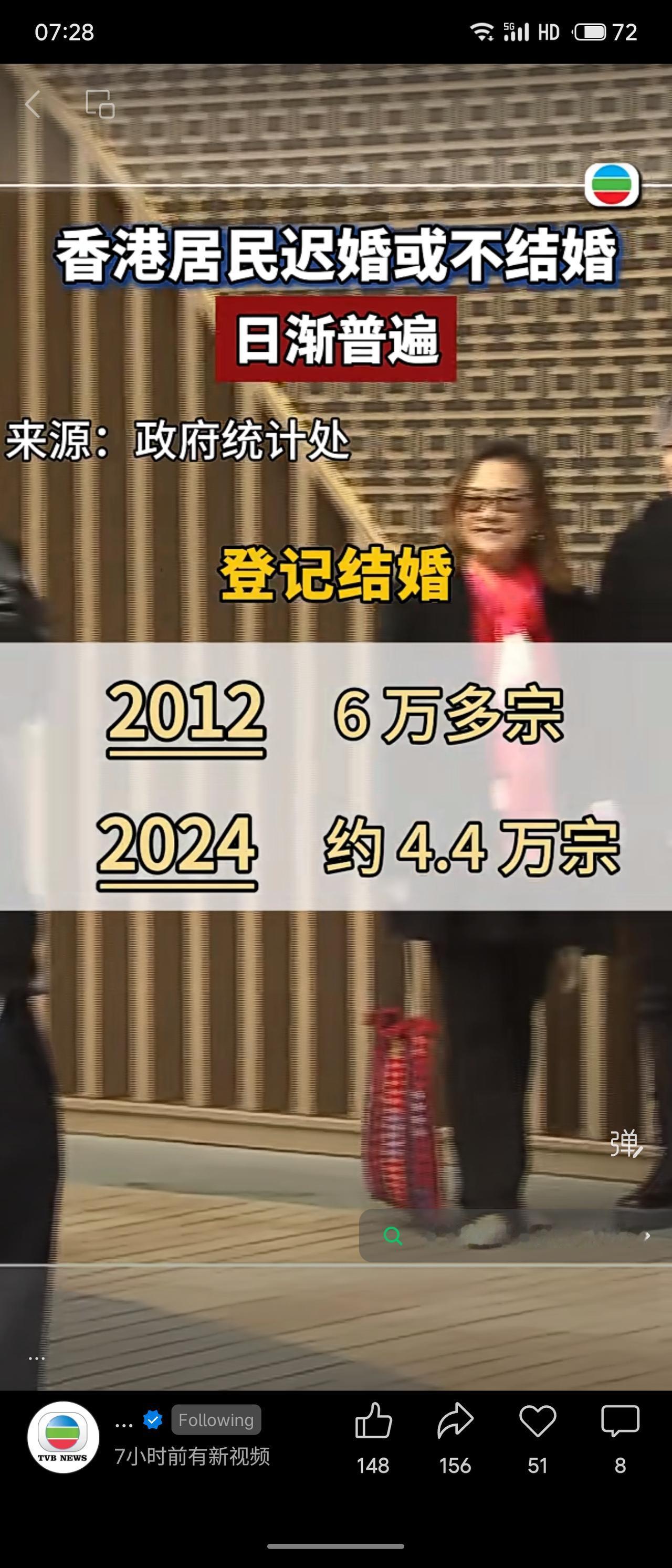 香港迟婚、不婚现象日益普遍,2024年结婚登记数较2012年下降逾25%。首次结婚年龄中位数男女均显著推迟,且跨境婚姻比例大幅上升,其中港女嫁内地男占比达40%。这反映了经济压力、社会观念变化及两地融合加深的影响。