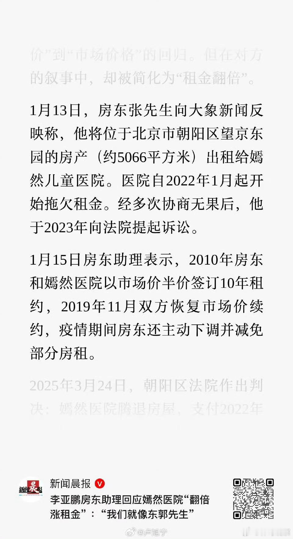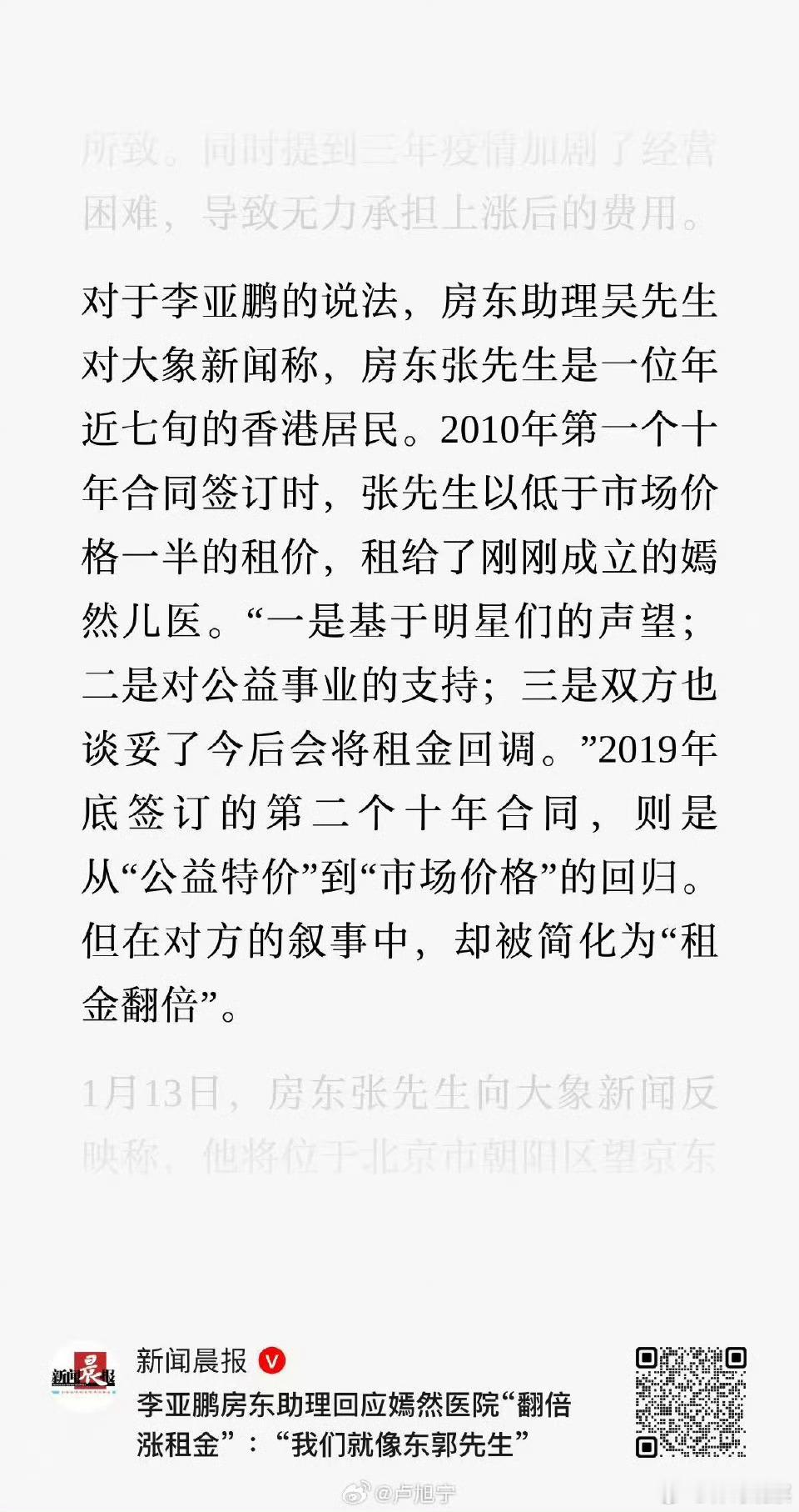 李亚鹏的房东也发声了:房东张先生是一位年近七旬的香港居民。2010年第一个十年合同签订时,张先生以低于市场价格一半的租价,租给了刚刚成立的嫣然儿医。"一是基于明星们的声望;二是对公益事业的支持;三是双方也谈妥了今后会将租金回调。"2019年底签订的第二个十年合同,则是从"公益特价"到"市场价格"的回归。但在对方的叙事中,却被简化为"租金翻倍"。1月13日,房东张先生向大 2010年房东和嫣然医院以市场价半价签订10年租约,2019年11月双方恢复市场价续约,疫情期间房东还主动下调并减免部分房租。李亚鹏