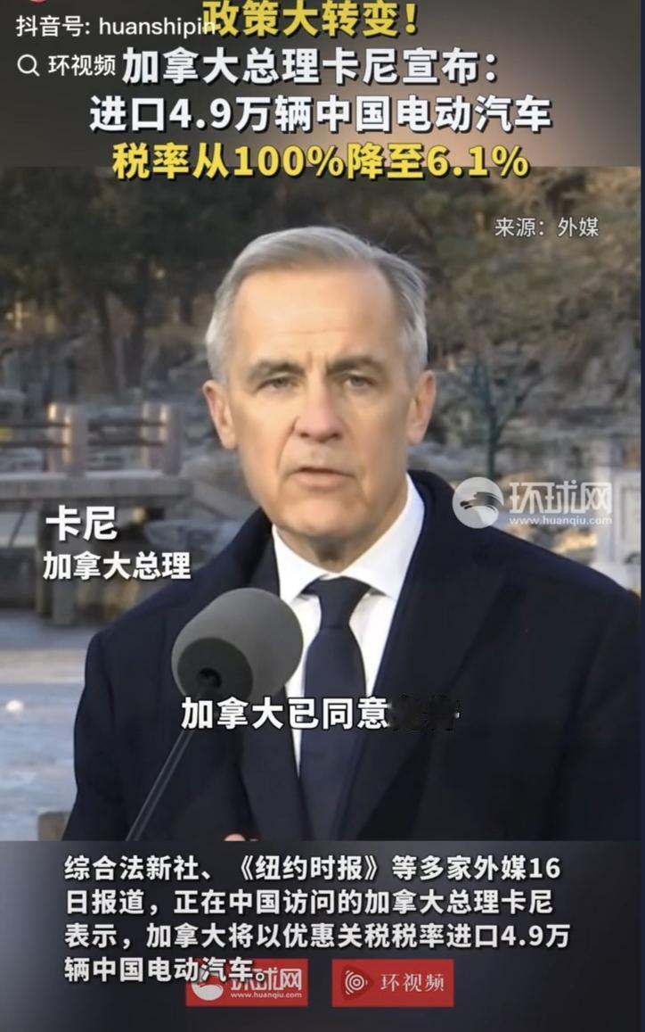 是的,加拿大挺不住了,终于对华妥协。 加拿大总理卡尼在访华期间,与中国签订了一份被外界称为“里程碑式”的贸易协议:加方决定以最惠关税进口中国电动汽车(每年限额为4.9万辆,关税为6.1%),以此换取中方下调加拿大农产品(尤其是油菜籽)的关税。 这次对华下调汽车关税,说白了就是挺不住后的妥协!之前加拿大跟风加征100%惩罚性关税,结果自家油菜籽等农产品被中方反制,国内经济承压、民众怨声载道。现在不得不松口,给出4.9万辆年配额,配额内关税降至6.1%,还计划逐年增加。 一边是本土市场缺靠谱电动车,一边是农产品出口急需打开通道,内外压力下只能放下身段,这波操作完全是现实所迫的务实让步。