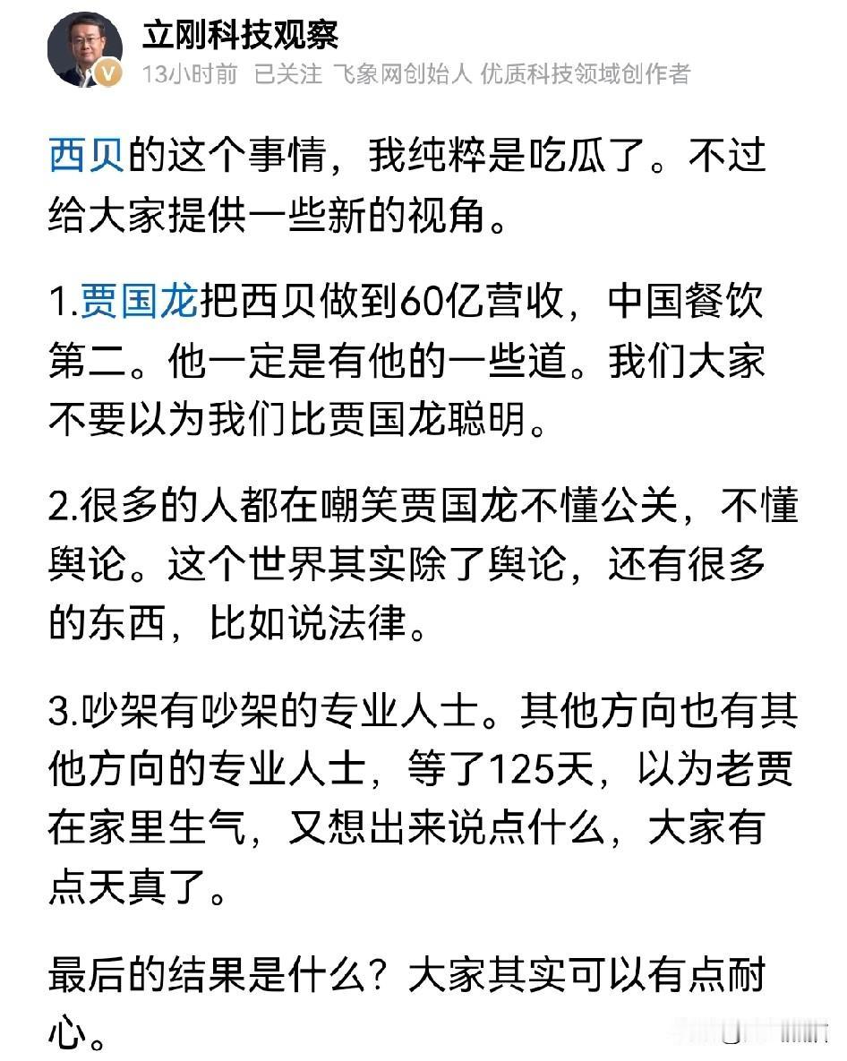 项立刚认为,贾国龙这次翻旧账不可能这么简单。 之所以能够把西贝做到年营收达到60亿,证明贾国龙也不是吃素的,肯定是比大多数人有头脑。 但是前期和罗永浩回怼,反而给西贝造成了不好的影响,从而造成了100多家门店的关闭。 而这次等了125天又把这个话题给提出来,可能是要让罗永浩付出点代价了。