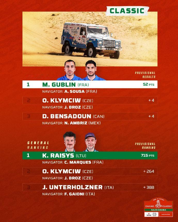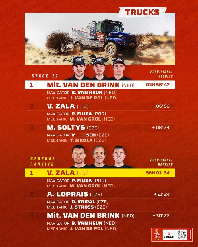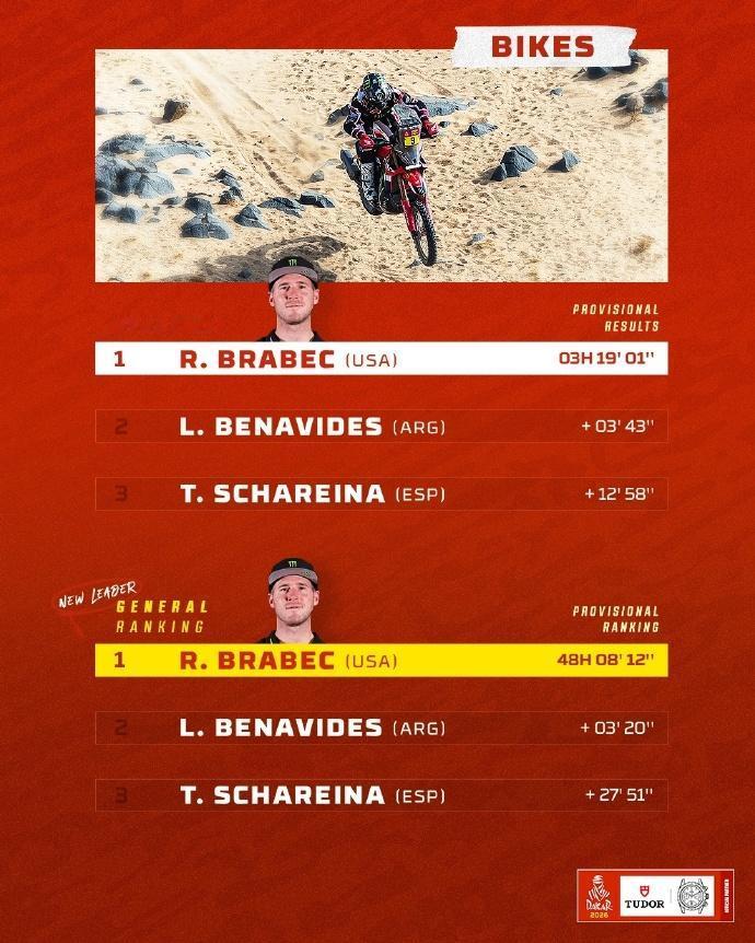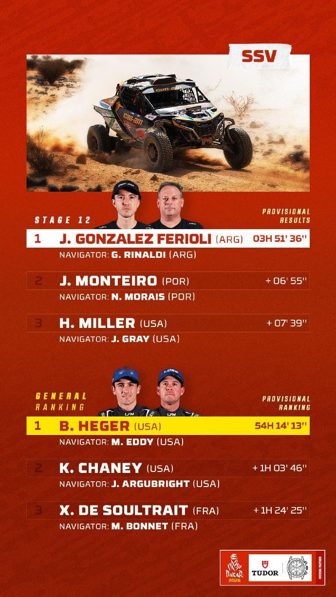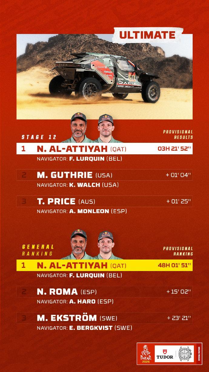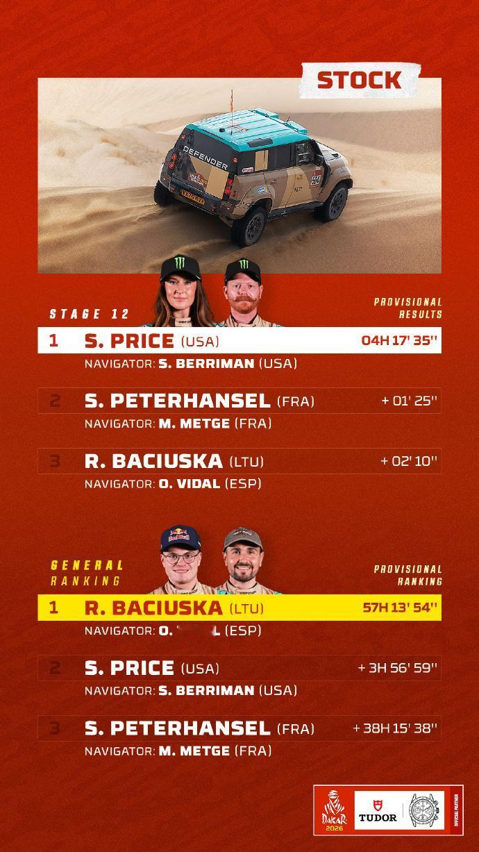 赛车:2026达喀尔拉力赛第12赛段战报,今天将迎来最后一个赛段的争夺。 第12赛段介绍 路线:阿尔赫纳基亚 ➡️ 延布 🛣 行驶路段 409公里 - 特殊赛段 311公里 🕒 发车时间(GMT+3): 🏍 摩托车组 07:50 🚗 汽车组 09:55 北京时间1月16日,2026沙特达喀尔拉力赛结束第12赛段的争夺。 摩托车组方面,布拉贝克取得赛段冠军,在总成绩榜上领先卢西亚诺·贝纳维德斯3分20秒,两位车手将在收官赛段一决高下。 汽车组方面,阿尔阿提亚取得职业生涯第50个赛段胜利,在总成绩榜上领先罗马超过16分钟,胜券在握。埃克斯特罗姆在总成绩榜上超越勒布上到第三,不过两位车手只差29秒而已。 7个组别成绩单(TOP3) 🚗 T1+组:阿提亚赛段冠军,巩固领先优势; 🚘量产T2组:卫士车队包揽前三,罗卡斯胜券在握; 🏍️摩托车组:布拉贝克赛段冠军,并领跑总成绩。
