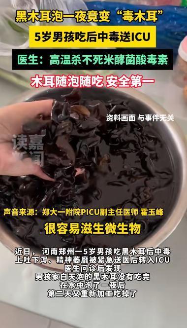 “悲剧还是发生了!”近日,河南郑州,一家人做饭木耳泡多了,一顿吃不完,便将剩下的木耳继续泡在水中,第二天又做了木耳,没想到5岁男孩吃后开始上吐下泻、精神萎靡,被紧急送医后转入ICU抢救!网友:隔夜木耳不能吃! 王女士(化名)在家做饭时,因需要使用木耳,便抓了大把泡在水中,然而,泡发了之后王女士发现一次根本将就用不完,于是她想着这么冷的天应该不会坏,就又泡了一整夜想着明一早就给做了。 第二天,王女士再次为家人做了木耳菜肴,尤其是她5岁的儿子,也吃了些,没多久,孩子就出现了上吐下泻、精神萎靡等症状,迅速出现脱水迹象。 家人赶紧将孩子送往医院,经过紧急处理,孩子的情况没有得到及时好转,最终被转入ICU进行抢救。 医生经过详细检查后,最终确认了孩子的中毒原因,罪魁祸首竟是一种名为“米酵菌酸”的毒素,它并不是普通的细菌,而是由一种叫做椰毒假单胞菌的酵米面亚种在温暖潮湿环境下繁殖后所产生的毒素。 木耳在长时间泡水的过程中,水温较低,给这种细菌提供了理想的生长环境,当木耳浸泡过久,毒素含量逐渐增加,最终导致了孩子的中毒症状。 米酵菌酸毒素的最大特点就是高温也难以彻底消除,这使得一些常见的处理方式无法起到作用,即使是通过煮沸,毒素依旧存在,对健康的威胁极大,这一发现让许多医生和食品安全专家感到震惊,提醒大家食材的保存和处理一定要严格规范。 专家指出,木耳是一种常见的食材,但它的保存需要特别注意,尤其是泡水后的木耳,必须在低温环境下储存,避免放置在常温下长时间浸泡,否则细菌很容易滋生,产生有毒物质。 虽然这件事情是无心之失,但此事也给大家敲响了警钟,家中有小孩或老人的家庭更应当关注食物的卫生和保存方法,确保食材在食用前完全干净、无害。 事件发生后,社交媒体上关于这一事件的讨论也引发了广泛关注,许多网友纷纷留言表示,“家里木耳泡了好几天了,这种情况真是太危险。” 有的网友甚至分享了自己的经历,“也曾泡过木耳,没想到竟然会有这么大的风险”,一些有经验的网友则提醒大家,木耳一定要及时烹饪,泡水时间不要超过12小时,最好是用冰箱存放。 此外,也有一些网友提出了更深层次的反思,认为这类食品安全问题频发,消费者在选购食材时应更加注意,尤其是外卖和加工食品,更要关注其来源和保存方式。 这起事故的最终教训提醒我们,在日常生活中,不仅要关注食品的新鲜和卫生,更要对食品的保存方式保持高度警觉,木耳这种常见食材,若处理不当,便可能成为隐形的“杀手”,消费者在享用美味的同时,也要时刻牢记食品安全,避免因疏忽大意而付出无法挽回的代价。 信息来源 :读嘉新闻