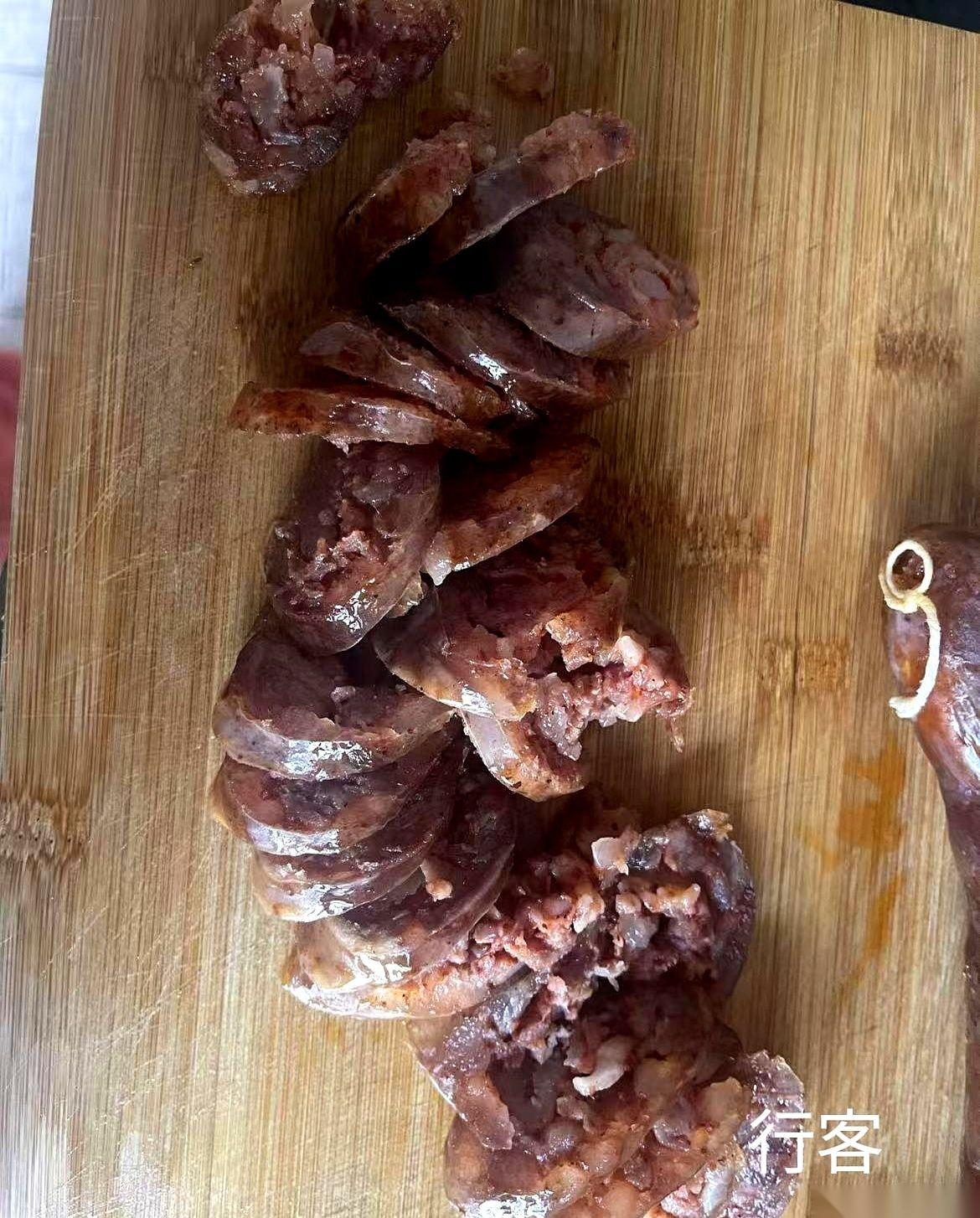 一刀下去,我那晾了十几天的香肠,没挺住。 里面的肉馅“哗”一下,全成了铺在案板上