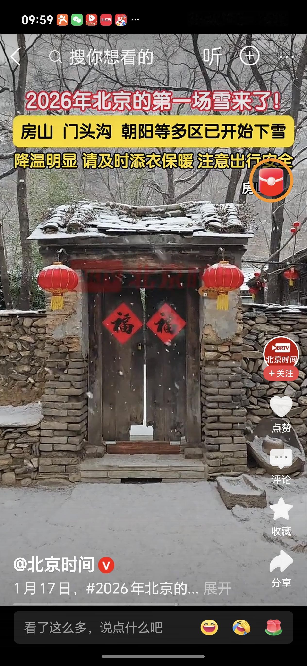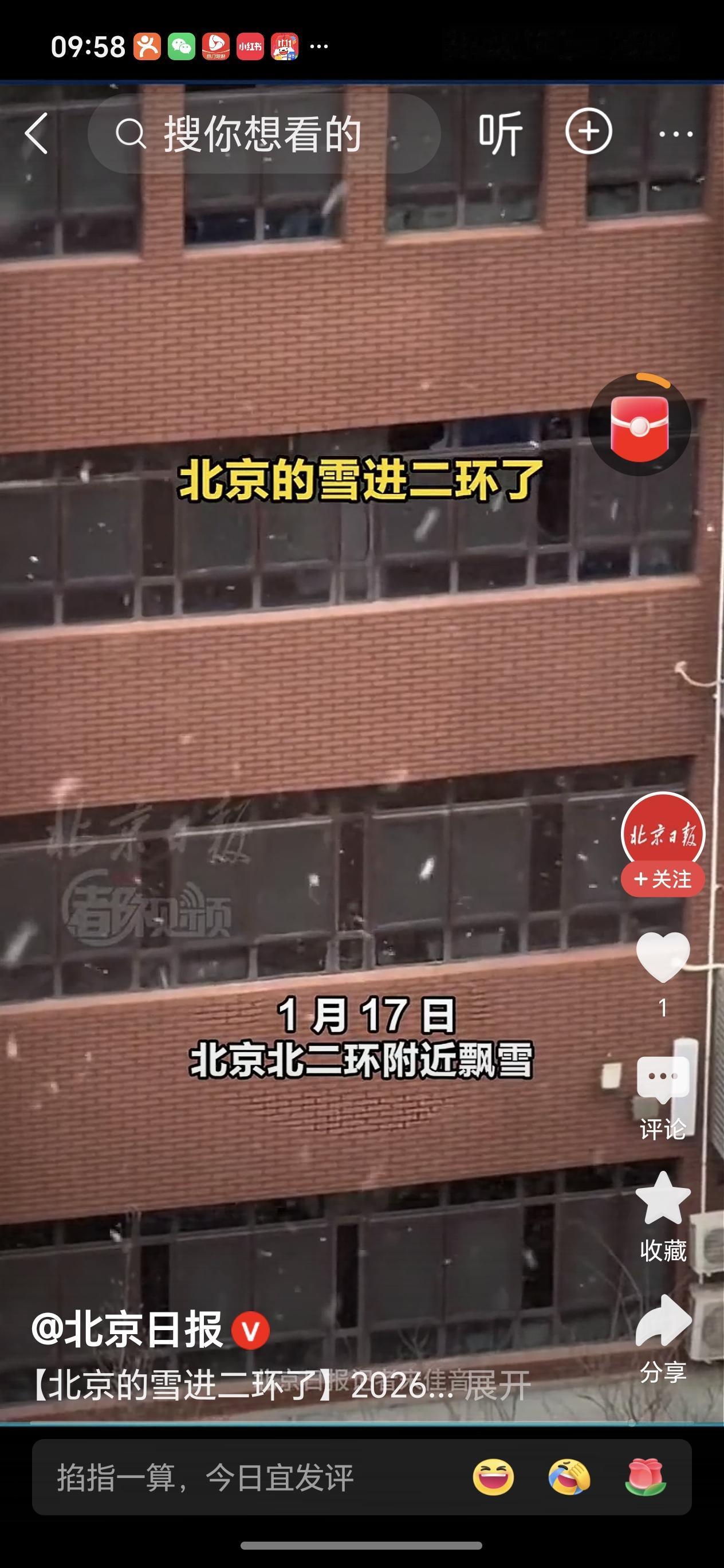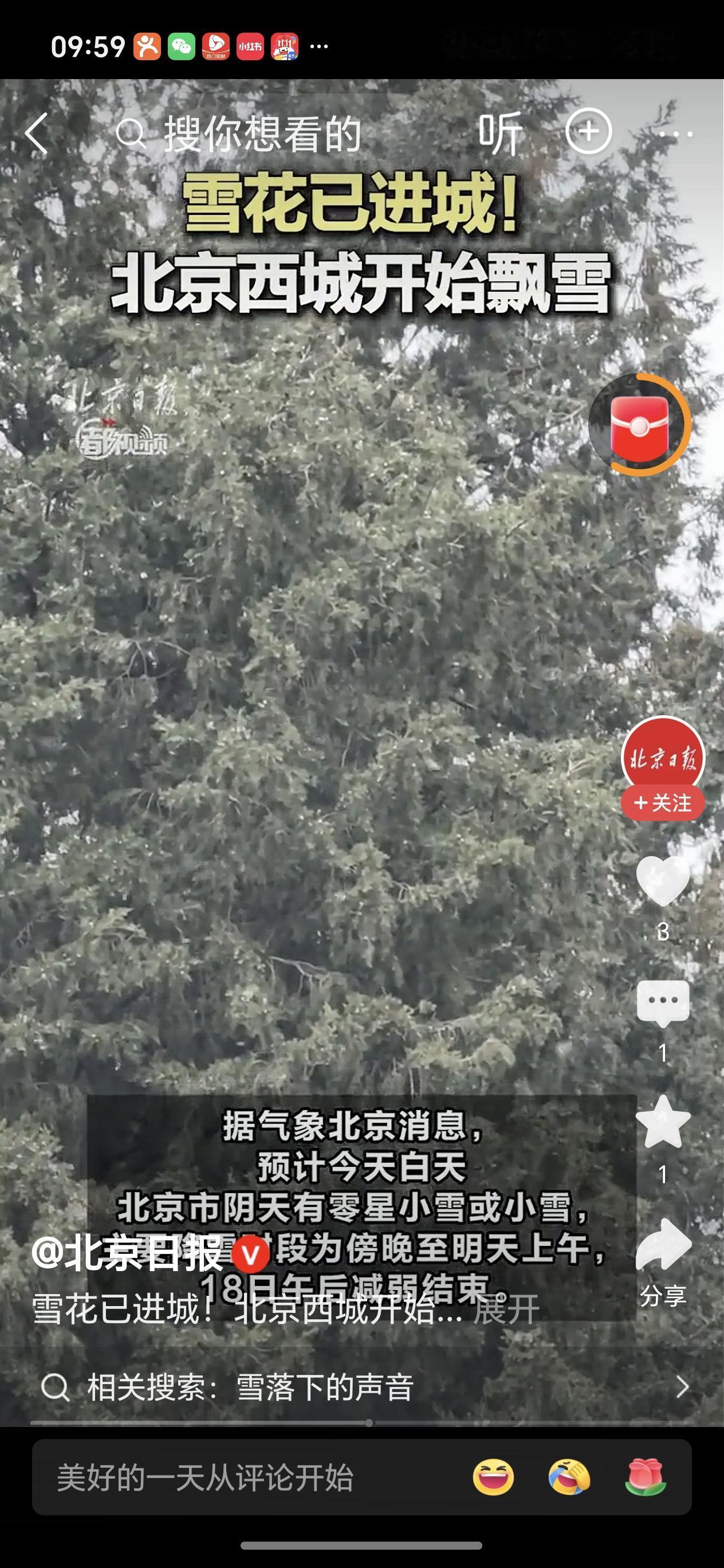 北京新年首场降雪 1月17日,北京迎来新年首场降雪,这新年首场雪,真是应了“瑞雪兆丰年”这句话。 下雪时,整个世界都变得柔软,空气里满是温柔的气息。尽管这场雪不大,但美得让人陶醉。雪花随风飞舞轻轻落在脸颊,凉意中唤醒心底的温柔记忆。 这场雪为平凡日子添了美好色彩,像美好的精灵,带来幸福快乐。真希望这份冬日浪漫能传递出去,让大家都顺遂安康!