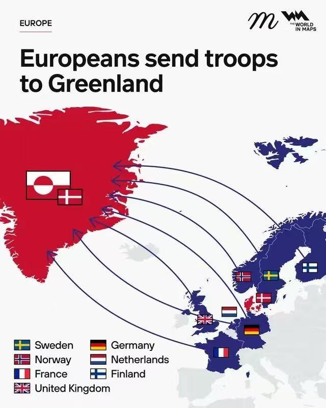 最近北极不太平!欧洲多国重兵集结格陵兰!欧洲7国凑了34名士兵部署格陵兰岛,加上丹麦和格陵兰本地军队,刚好形成“八国联军”的架势,这事儿引发不少关注。 仔细看看兵力:法国15人、德国13人,挪威和芬兰各2人,英国、荷兰各1人,都是应丹麦邀请,以“北极耐力行动”联合军演的名义派兵。最早是法国先派了15名精锐山地兵,后续各国陆续跟进,别看总人数才34人,比美军驻格陵兰图勒基地的150人还少,但其象征意义远大于实战价值。 背后根源是美丹关于格陵兰岛的谈判破裂,特朗普此前的“夺岛”言论让欧洲各国警惕不已。丹麦为了保住对格陵兰的主权,赶紧邀盟友抱团,欧洲国家也借机表态:一方面支持丹麦主权,另一方面也是想制衡美国,推动欧洲战略自主。 这些士兵分工不同:法国要后续增派海空力量,德国13人是侦察组,评估支援能力后17日前就撤离,挪威、芬兰派的是联络官,英荷则是象征性派兵。而美国这边,虽然常驻150人,却坚持“夺岛计划不变”,让美欧分歧越来越明显。 这场34人的“小部署”,实则是北极地缘博弈的缩影。欧洲借小兵力传递“主权不容侵犯”的信号,同时强化在北极的存在感,与美俄在航道、资源等领域的竞争也会越来越激烈,北极这块“净土”的博弈还将持续升温。 北极博弈 欧洲战略自主 国际局势