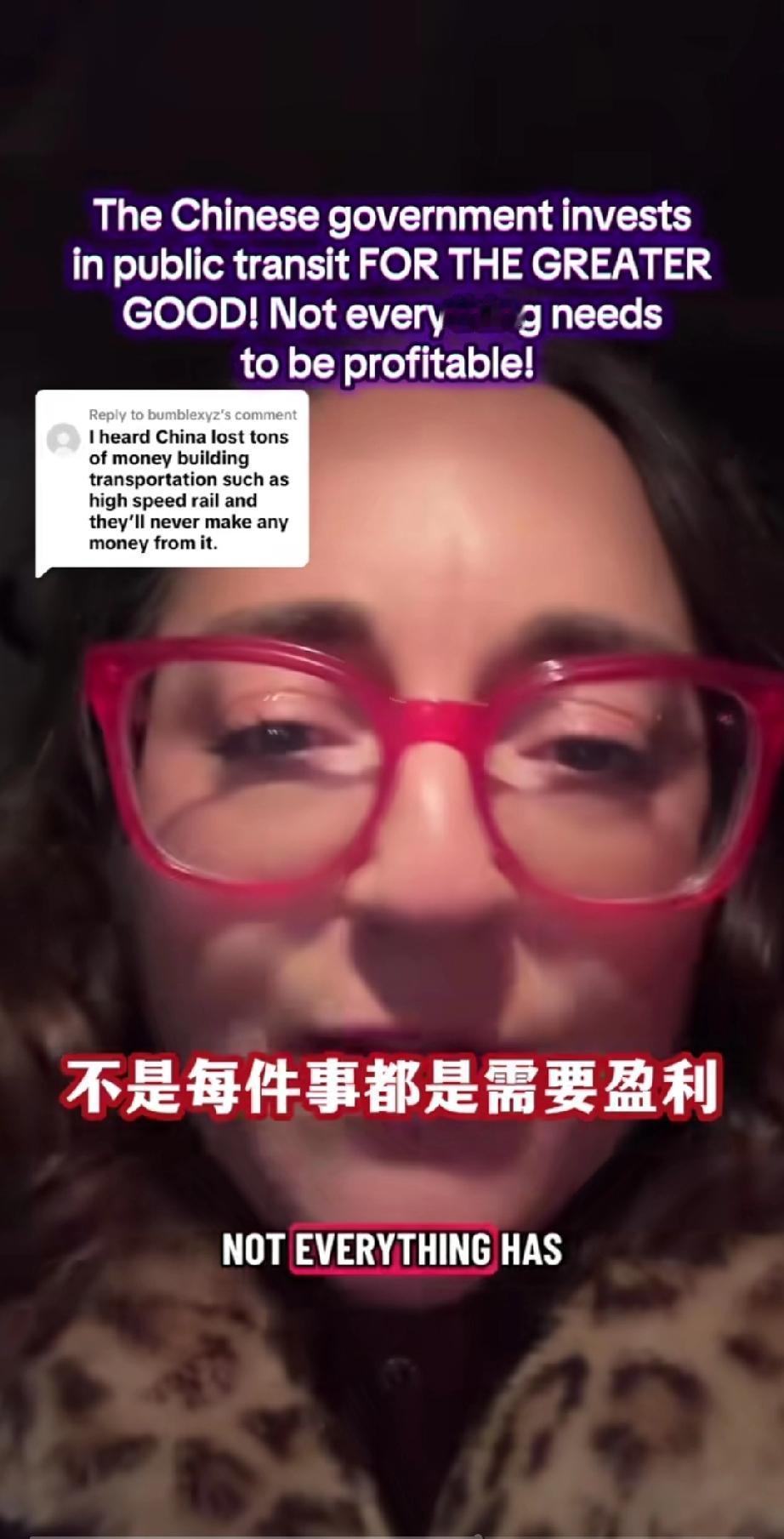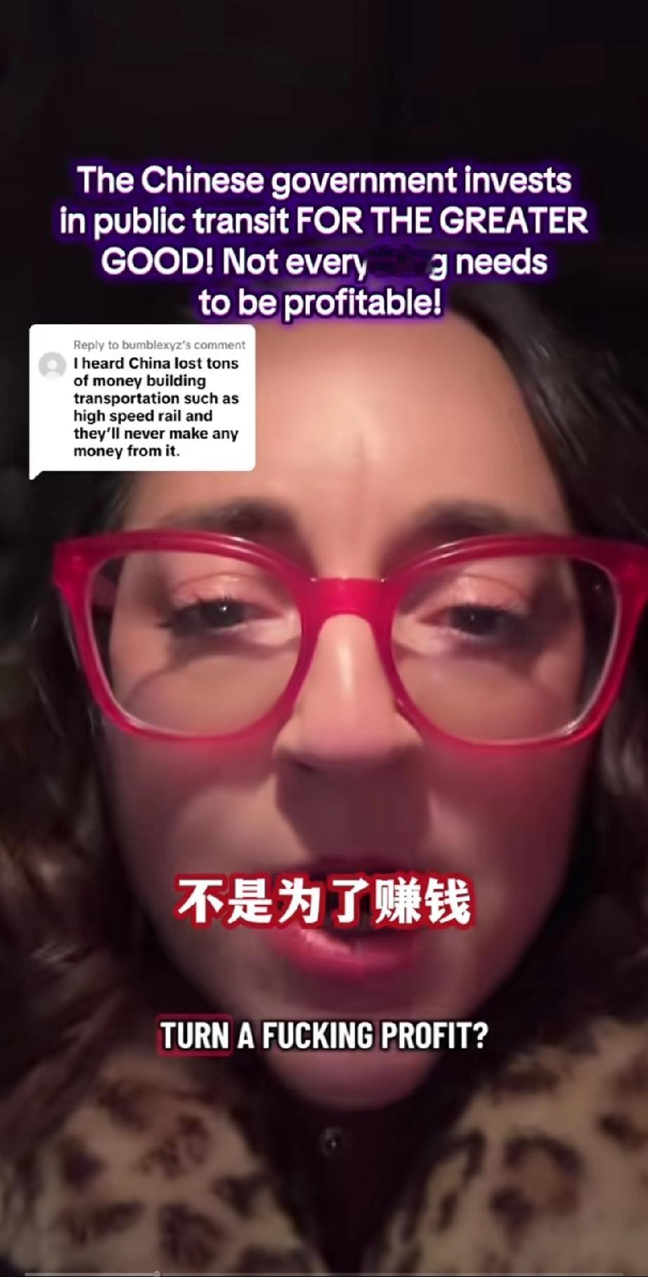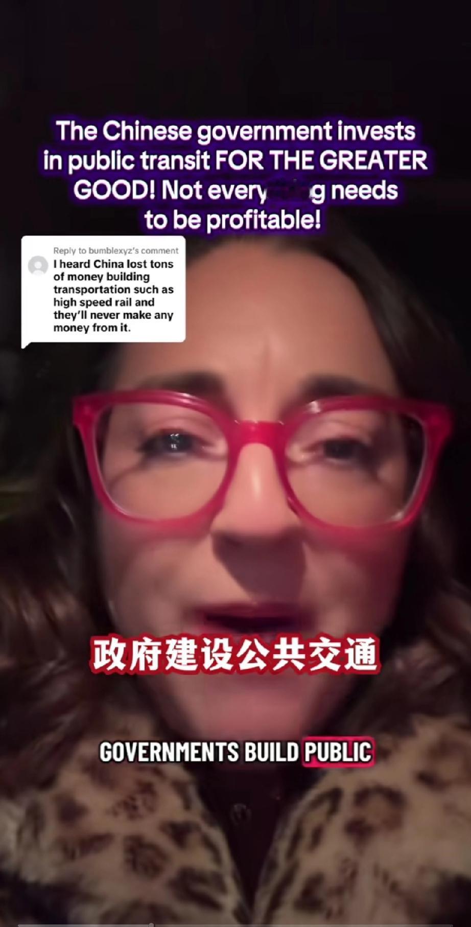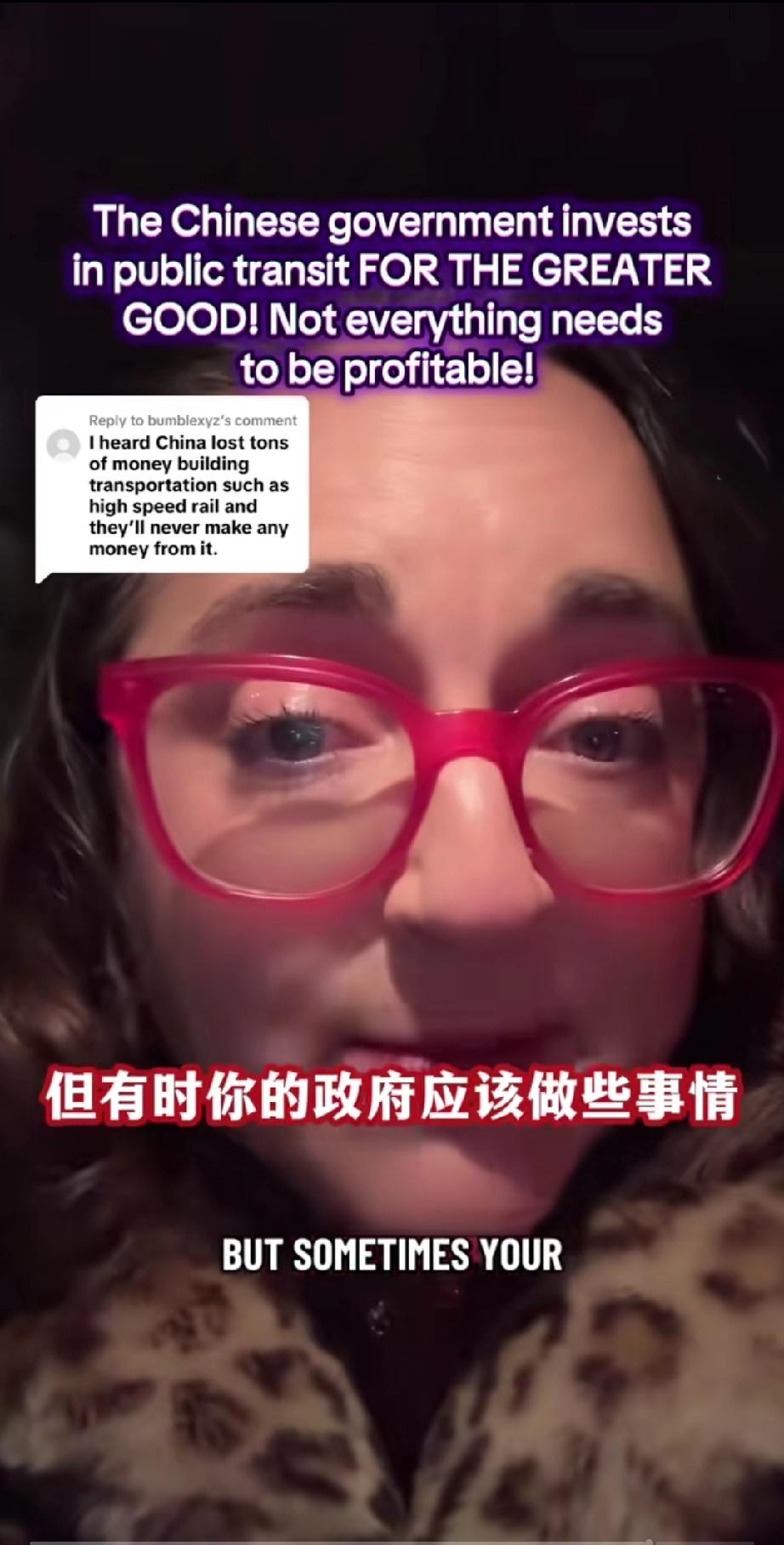 一个美国女网友发视频痛斥美国政府!原因竟然是因为她得知中国政府投入巨大资金建设运行国家公共交通,虽然亏损,却依然坚持投入! 她在视频里咬牙切齿的说: “你们这些人都得了绝症,根深蒂固的资本主义观念,不是每件事都需要盈利的,但有时你的政府应该做些事情,政府建设公共交通,不是为了赚钱,因为这对国家有好处,因为她帮助人民,提高了人民的生活质量,它改善了环境,这样人们就不用到处都要开车去,建设公共交通是为了人民更大的利益!” 总之她认为,国家公共建设不应该以钱为本而应该以人为本,你觉的她说的对吗?
