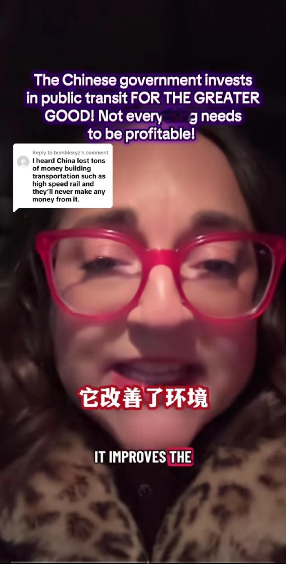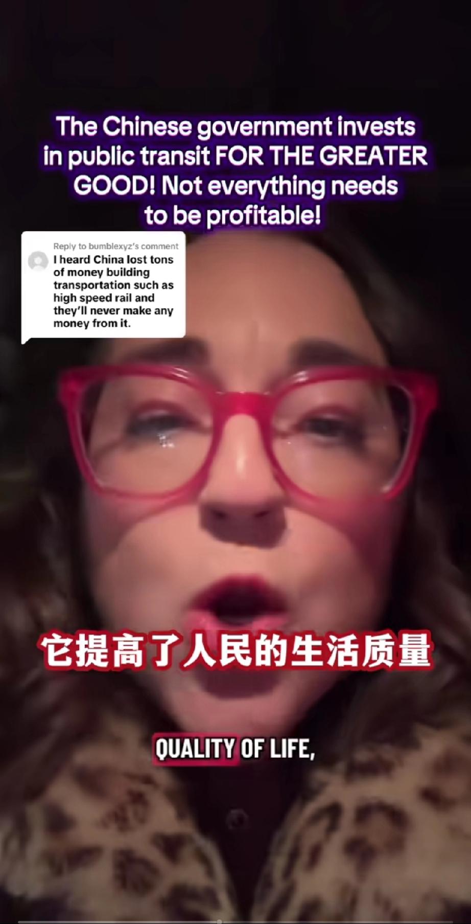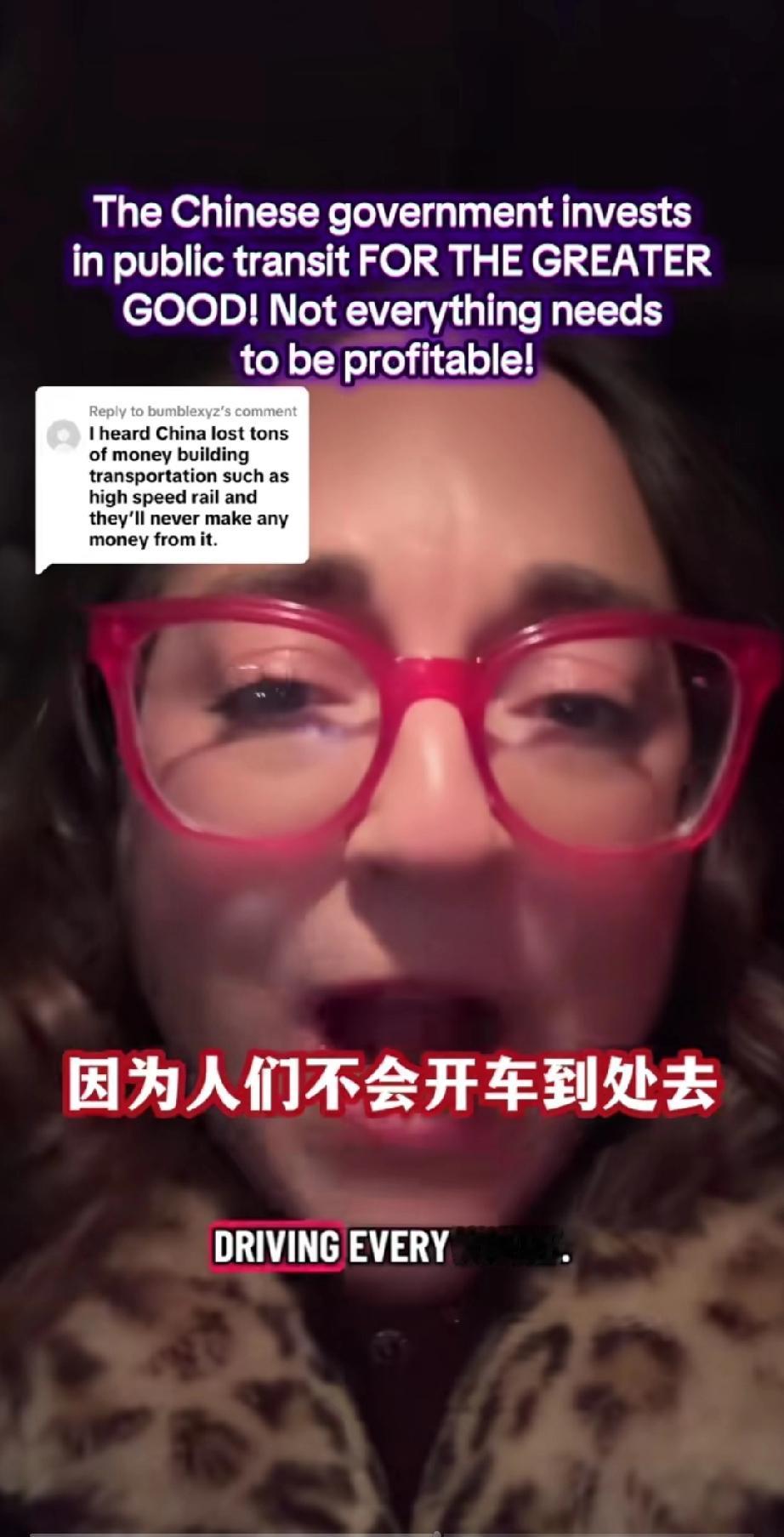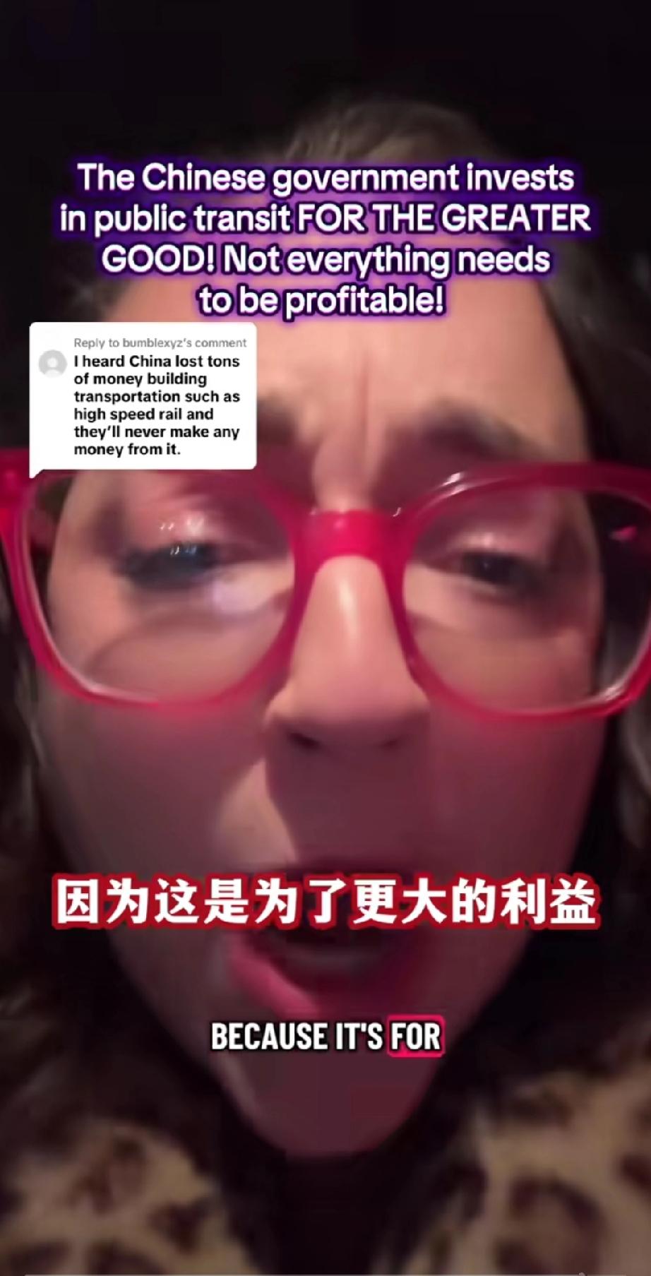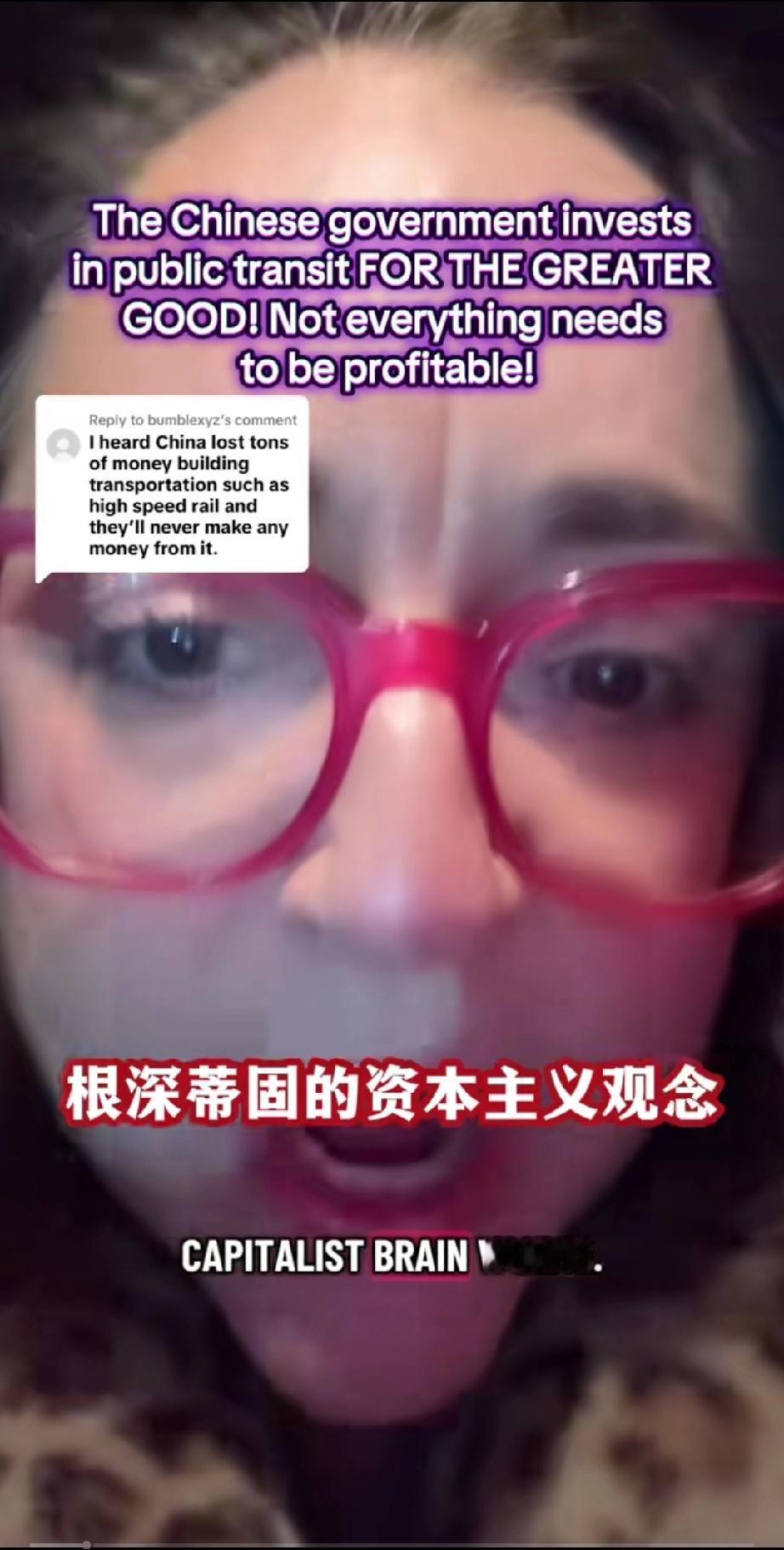 一个美国女网友发视频痛斥美国政府!原因竟然是因为她得知中国政府投入巨大资金建设运行国家公共交通,虽然亏损,却依然坚持投入! 她在视频里咬牙切齿的说: “你们这些人都得了绝症,根深蒂固的资本主义观念,不是每件事都需要盈利的,但有时你的政府应该做些事情,政府建设公共交通,不是为了赚钱,因为这对国家有好处,因为她帮助人民,提高了人民的生活质量,它改善了环境,这样人们就不用到处都要开车去,建设公共交通是为了人民更大的利益!” 总之她认为,国家公共建设不应该以钱为本而应该以人为本,你觉的她说的对吗?