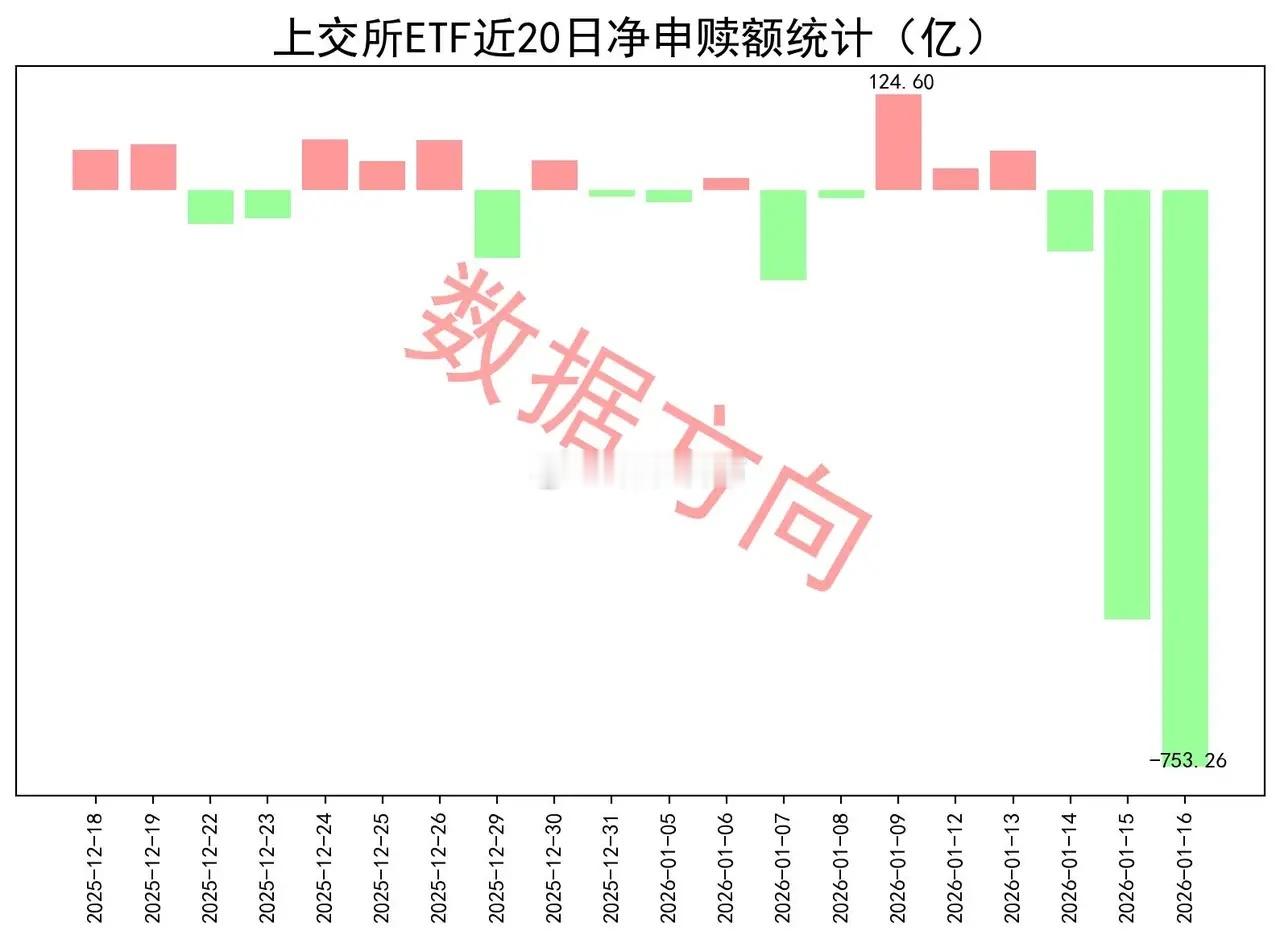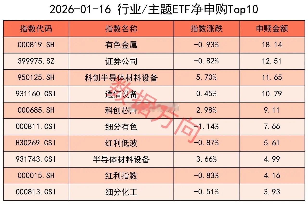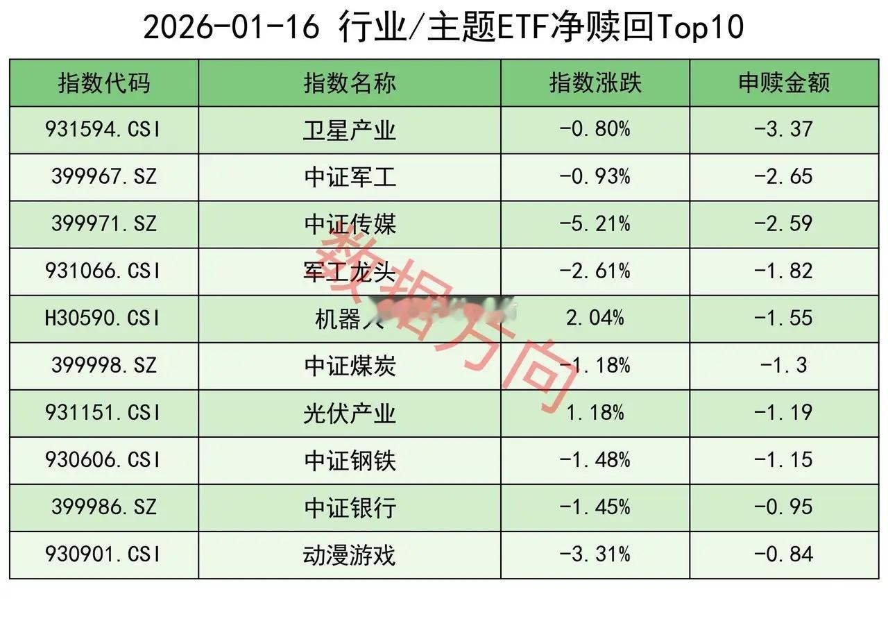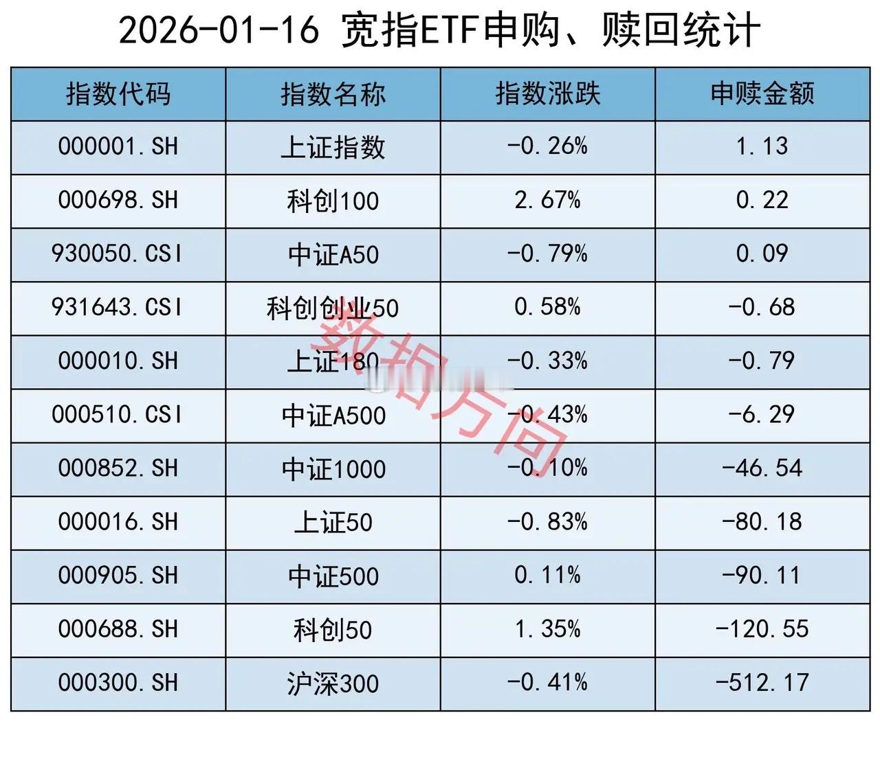 神秘资金大幅流出1300亿!1月16日星期五,大盘高开低走收跌,半导体领涨,汽车、机械、电力设备亦有不错表现,AI应用跌幅居前。上证指数跌幅0.26%,上交所ETF合计净赎回753.26亿元,这个力度非常大!很多人对此数据没有概念,简单解释一下。在此之前,单日净赎回最高纪录为202亿;1月15日本周四大幅净赎回560.72亿,接近之前纪录的三倍;本来以为已经到了极限,结果1月16日本周五继续大幅净赎回753.26亿,比周四还多了193亿!两天,累计净赎回1314亿,这还仅仅只是沪市的,如果把深市也算进来,金额只会更大。请不要怀疑,没有任何一家机构,或者几家机构联手,可以有如此强大的力量。请不要怀疑,大操盘手的能力。看个例子,2025年4月7日、4月8日两天,上交所股票型ETF分别净申购525亿和832亿,两天累计净申购1357亿,力度和这次差不多,但是方向相反。大盘于4月7日当天见底3040点,然后涨了8个多月,一直到本周三的4190点才算见顶。想要在这个市场上玩,就要对大操盘手保持敬畏之心!宽指仅有上证指数(1.13亿)、科创100指数(0.22亿)、中证A50指数(0.09亿)获得小幅净申购。沪深300指数(-512.17亿),被大幅净赎回超过500亿!科创50指数(-120.55亿)、中证500指数(-90.11亿)、上证50指数(-80.18亿),净赎回也都超过了80亿。中证1000指数(-46.54亿),净赎回近50亿。中证A500指数(-6.29亿)、上证180指数(-0.79亿)、科创创业50指数(-0.68亿),分别被小幅净赎回。行业和主题 有色金属指数(18.14亿)、细分有色指数(7.66亿)、细分化工指数(3.93亿),一起进入申购榜。科创半导体材料设备指数(11.65亿)、科创芯片指数(9.11亿)、半导体材料设备指数(4.99亿),一起进入申购榜。红利低波指数(5.61亿)、红利指数(4.16亿),一起进入申购榜。其他进入申购榜的还有:证券公司指数(12.51亿)、通信设备指数(10.79亿)。卫星产业指数(-3.37亿)、中证军工指数(-2.65亿)、军工龙头指数(-1.82亿),一起进入赎回榜。中证传媒指数(-2.59亿)、动漫游戏指数(-0.84亿),一起进入赎回榜。中证煤炭指数(-1.3亿)、中证钢铁指数(-1.15亿)、中证银行指数(-0.95亿),一起进入赎回榜。其他进入赎回榜的还有:机器人指数(-1.55亿)、光伏产业指数(-1.19亿)。