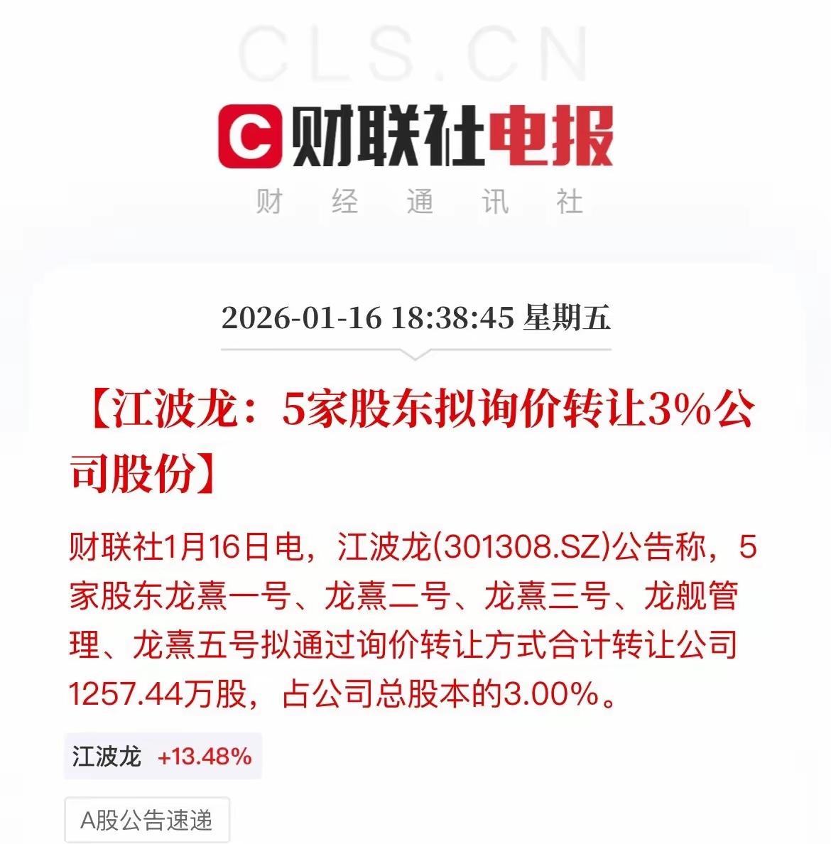 存储利空,半年翻3倍的江波龙,公告要询价转让了。 本是风光无限,结果1月16日就公告要询价转让了。都说股价涨得好,股东就有“花样”,这次江波龙算是应了这话。而且据说这转让金额可能是其过去利润总和、研发费用的十倍,这让人不禁想问,公司发展到底是为了长期壮大,还是让股东借机套现?