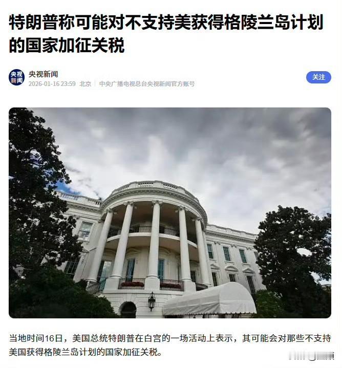 特朗普威胁以关税施压获取格陵兰岛… 当地时间1月16日,特朗普在白宫医疗问题圆桌会上称,若他国不支持美国获取格陵兰岛,将对其加征关税,理由是“格陵兰对美国国家安全至关重要” 。他还提及美国拥有“世界最强军队”,并以委内瑞拉、伊朗相关行动为例,强调美国军事能力,同时表示要与北约就此谈判 。 当年美术生都不敢说,谁不支持德国获得苏台德地区就惩罚谁。疯了吗,这老头。