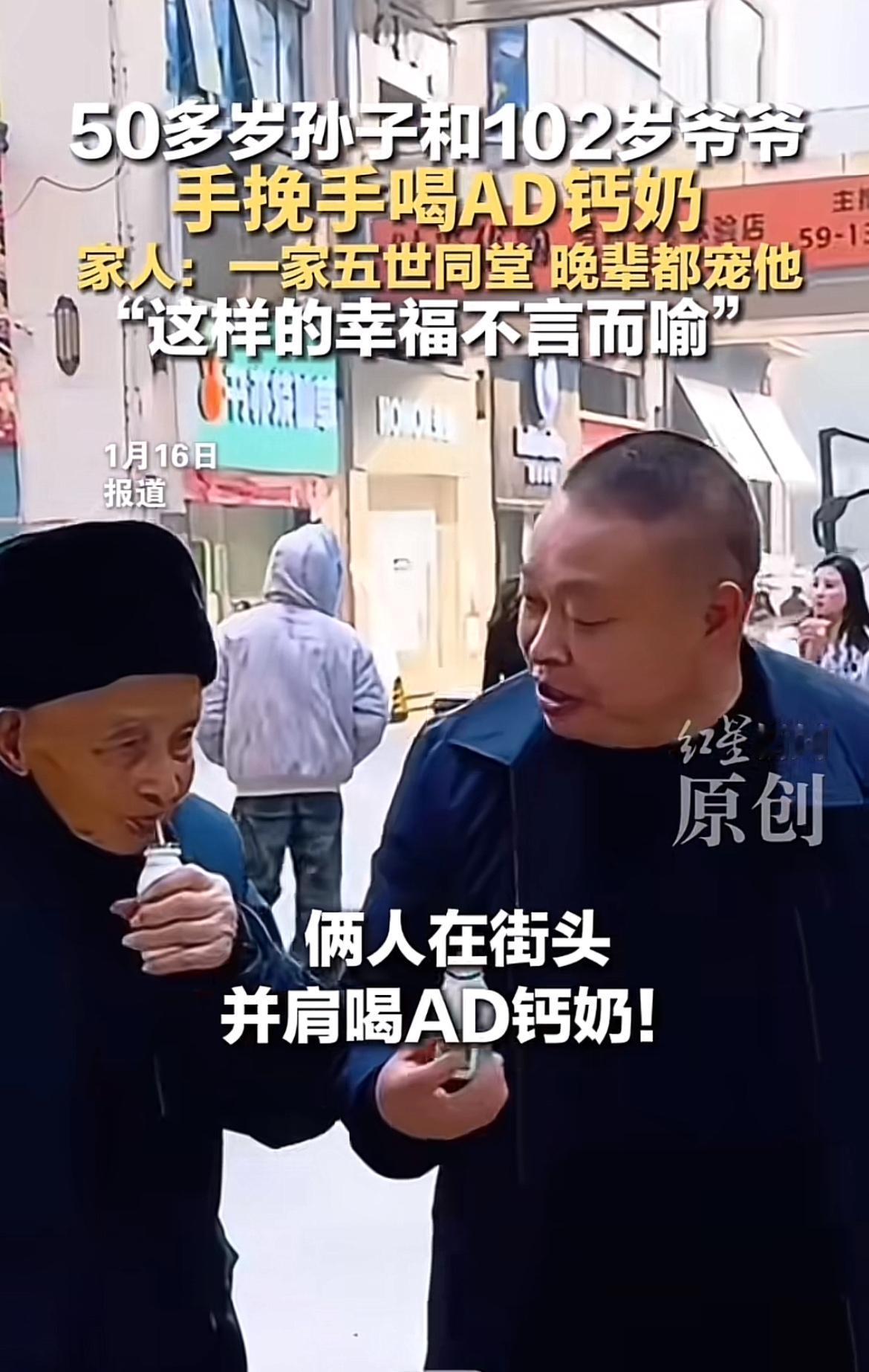 最近网上一个视频超火,50多岁的孙子带102岁爷爷在街头并肩喝AD钙奶。画面里爷孙俩一人一瓶,边走边喝,温馨感直接溢出屏幕,视频点赞快到10万了。 拍摄者是孙儿媳妇李女士,这是他们日常生活的真实记录。老人王家华住在四川达州,一家五世同堂。他身体硬朗,每顿饭都要吃猪腿肉配红豆腐和稀饭,作息规律,晚上八点睡,早上七八点起。这样的画面让人感受到亲情的温暖,也让人羡慕这跨越世纪的祖孙情,希望老人能一直健康长寿!