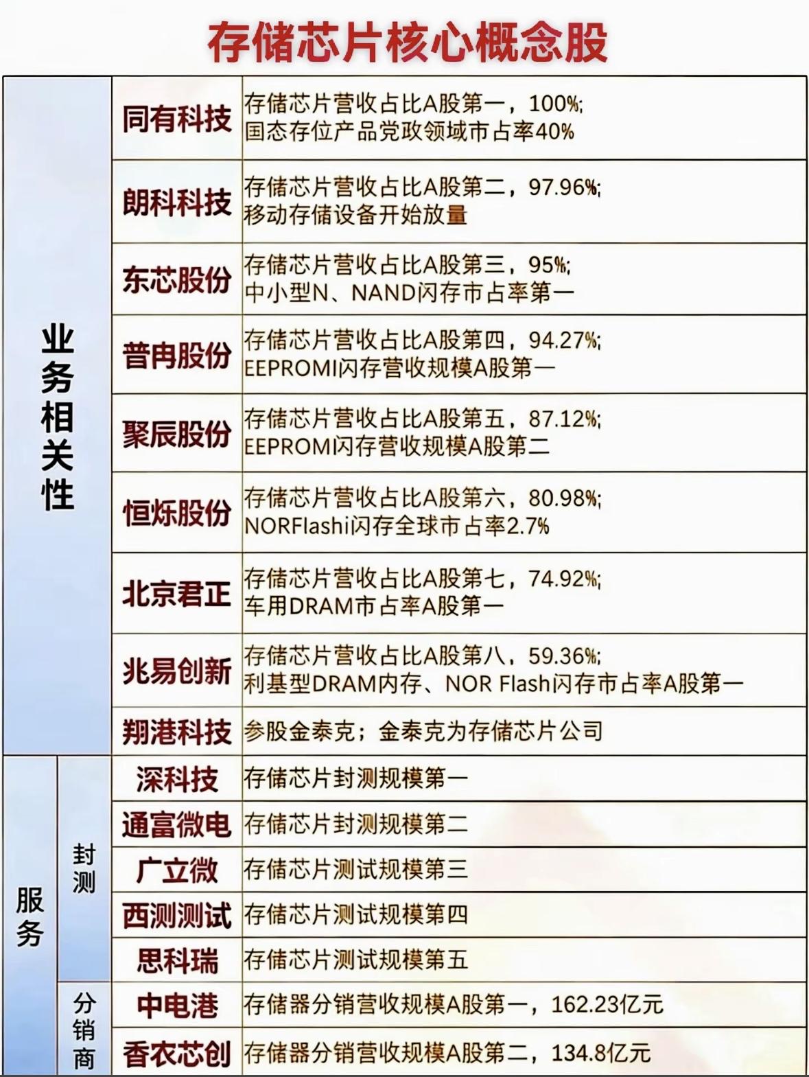 存储芯片概念股全解析,带你挖掘潜力股!📈💰 "存储芯片龙头股盘点:华海诚科领跑环氧塑封料,兆易创新NOR闪存称王,北京君正车用芯片夺冠,光存储看易华绿华录双雄。"