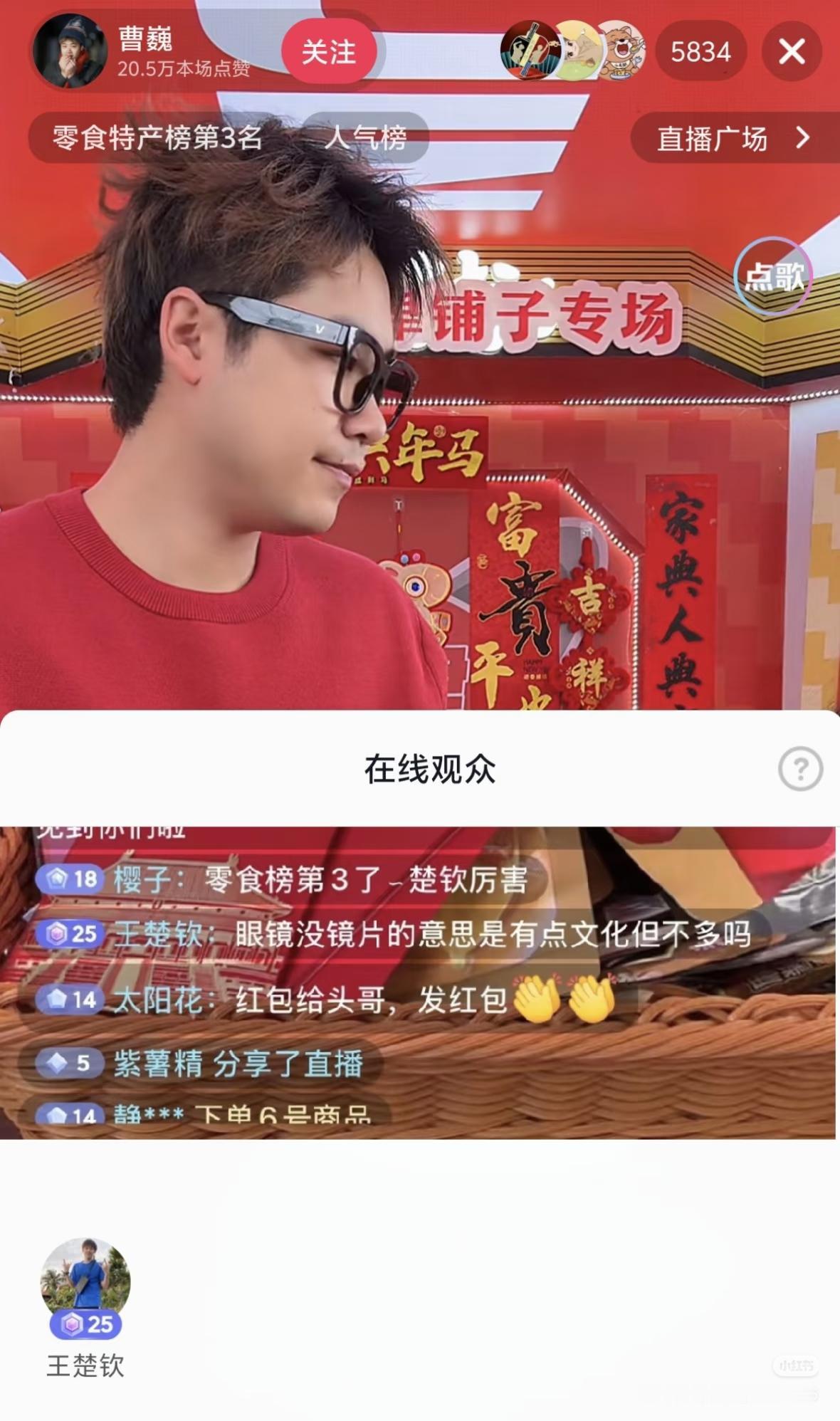 今天曹魏直播, 这人气也是刚刚的。 中间来了一位榜一大哥, 这榜一大哥嘴也是够毒,哈哈, 他说眼镜没镜片好像是有点文化但不多 哈哈,王楚钦这嘴真是够毒的呀。 榜一大哥说啥都行,哈哈, 直播间氛围也好的很, 后来还有位姐姐与楚钦老师争榜一, 楚钦老师玩了一会就走了。 今天直播看的好多人说这下与楚钦同在一个间了, 我们在上网的时候他也在上网[黑线]