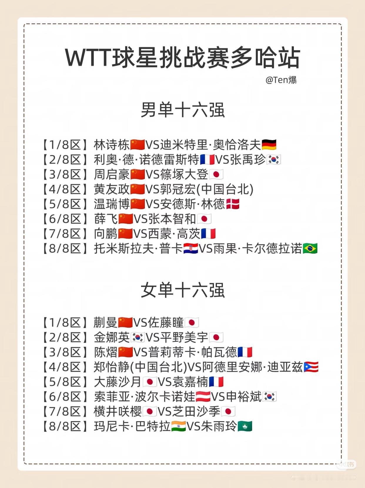 多哈球星挑战赛, 看看男女队的十六强名单, 女队就剩陈熤、蒯曼了。 实话实说, 女队孙颖莎、王曼昱、陈幸同、王艺迪这四个人不在, 也没比男队好到哪里去。 男队今天薛飞又要对阵张本智和了, 加油!加油!