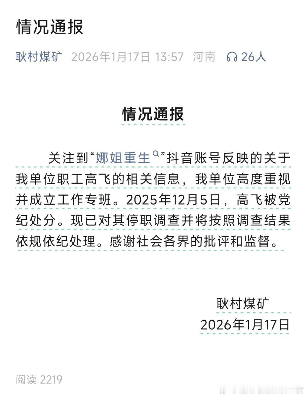耿村煤矿高飞被停职调查“女子向丈夫视频道歉”后续:丈夫高飞,被停职调查!出轨被