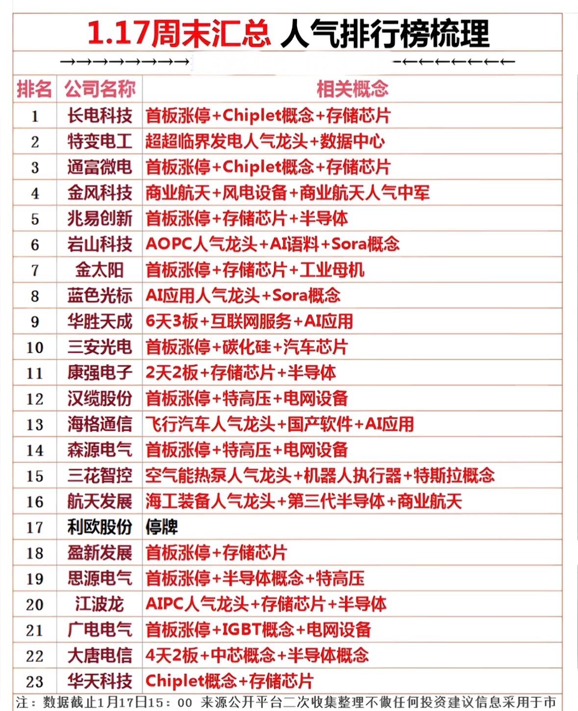 1月17日周六人气排行榜梳理 科技股热度飙升!芯片、AI、航天领涨,存储与半导体受捧,风电特高压紧随,概念龙头集体爆发 科技股热度榜:芯片存储领涨,AI应用与商业航天齐飞,特高压、半导体概念活跃