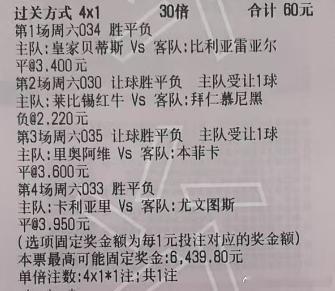 035 葡超 里奥阿维vs本菲卡里奥阿维+1.5 让平 1-2 2-3034 西甲 皇家贝蒂斯vs比利亚雷亚尔进球数 双 平 1-1 2-2033 意甲 卡利亚里vs尤文图斯卡利亚里+1 平 1-1 2-2030 德甲 莱比锡红牛vs拜仁慕尼黑拜仁慕尼黑-1 让负 0-3 1-32串:034平 030让负4串:034平 030让负 035让平 033平成绩串:030(0-3 1-3)033(1-1 2-2)035(1-2 2-3)