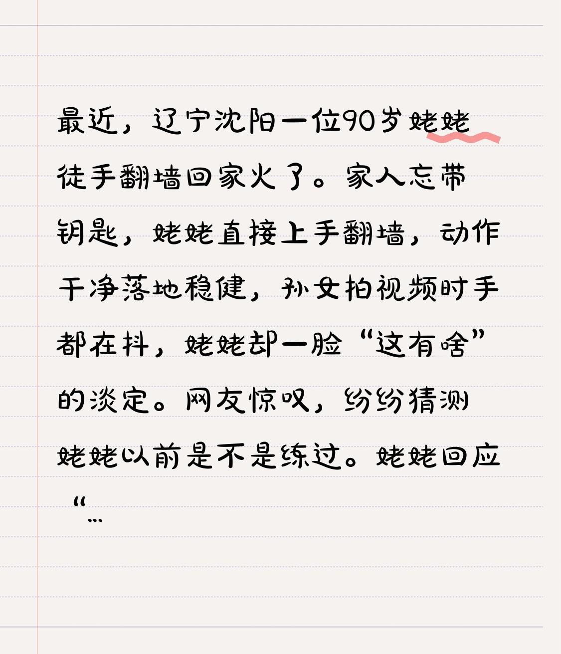 最近,辽宁沈阳一位90岁姥姥徒手翻墙回家火了。家人忘带钥匙,姥姥直接上手翻墙,动作干净落地稳健,孙女拍视频时手都在抖,姥姥却一脸“这有啥”的淡定。网友惊叹,纷纷猜测姥姥以前是不是练过。 姥姥回应“我真出息呢”,还说“门锁了不能干等着,墙又不高”“年轻时干活,这不算啥”“动一动筋骨舒坦”。她主打不内耗,两耳不闻窗外事。她撕掉了衰老的刻板标签,用行动告诉我们年龄只是数字姥姥在京日记