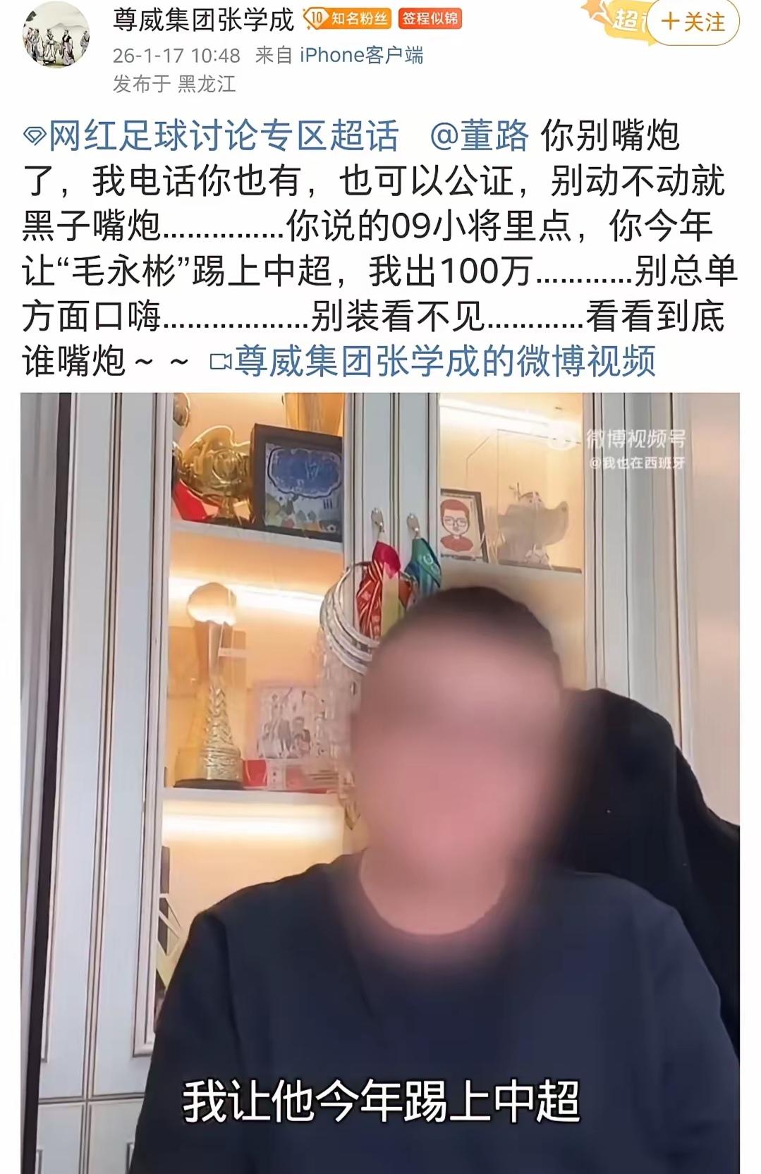 越闹越大,博主100万约战董路,事关上海海港。 事情的起因是著名解说员、足球小将发起人董路表示,他有能力让任何一名小将在2026年在任何一支中超球队踢上比赛,并开出100万的赌注。 博主“尊威集团张学成”发文,让上海海港梯队的毛永彬踢上中超就出100万,让董路别装看不见。 他们俩是什么关系我们不知道,不过既然互相有联系方式,应该也不算陌生人了,相约的话两人私下联系应该问题不大,在网上约战应该炒作的目的多一点。