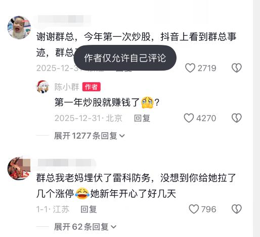 陈小群被骂关闭评论了!海格一字跌停后,很多人都说陈小群是不是被针对了,直到周五的龙虎榜一出,才知道他悄悄已经把商业航天的货给出完了。很多人都跑去陈小群评论区问,为何做兄弟不在心中,没想到陈小群连评论区都给关闭了。个性签名写着,有人的地方就有江湖,谣言止于智者,休息了!难道说,大家都冤枉群总了?重庆解放碑不是他,以后是不是和前年的六一路一样,选择换席位?事实上,从去年开始,很多人还是跟着陈小群吃了不少肉的,只是这次遇到大退潮,盲目去跟席位溢价,被闷也不冤枉