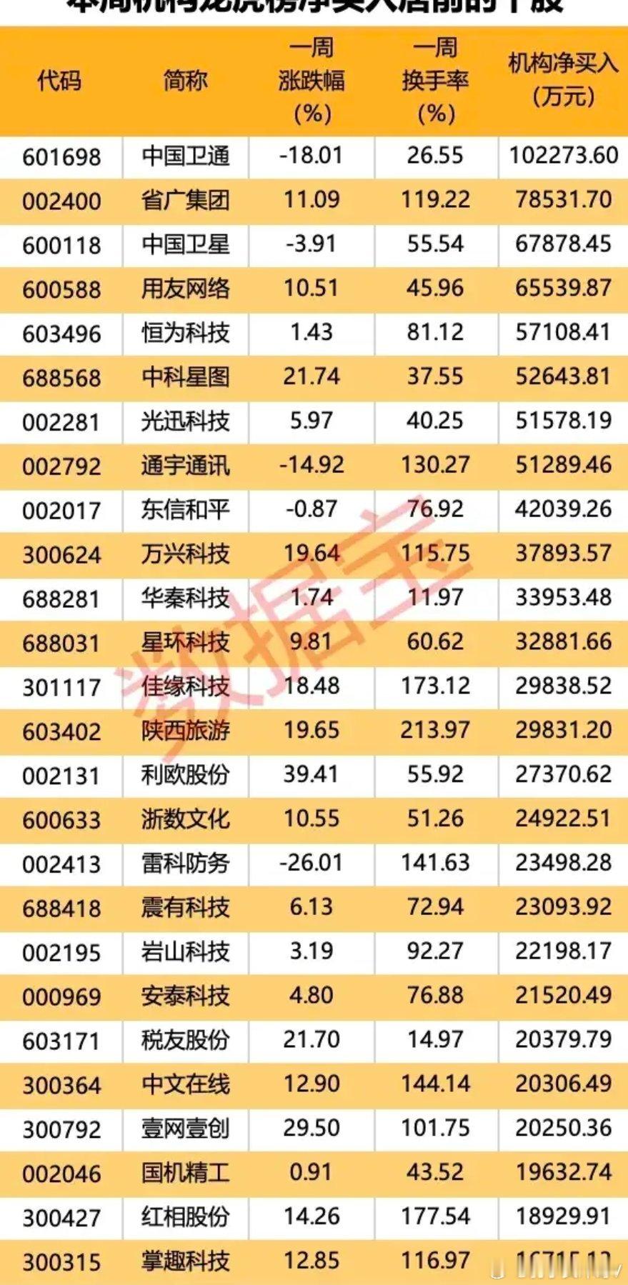 本周机构龙虎榜净买入:逆势布局+顺势加仓 三大主线浮出水面本周龙虎榜机构资金动向覆盖通信、军工、AI算力、消费等多元赛道,整体呈现**“逆势布局核心资产+顺势加仓景气标的”**的鲜明特征。一方面,中国卫通等标的在大幅调整中获机构逾10亿元净买入,彰显资金对高景气赛道的长期布局决心;另一方面,省广集团、中科星图等涨幅居前的标的同步迎来机构加仓,印证资金对“题材+业绩”共振标的的追捧。从交易层面看,上榜个股换手率普遍偏高,资金分歧与共识并存,机构的主动进场行为,或预示相关板块后续具备修复或上行的动力。核心标的机构动向拆解1. 中国卫通:卫星通信绝对龙头,本周股价逆势下挫18.01%,却斩获超10亿元机构净买入。商业航天政策红利持续释放,卫星带宽服务的长期增长潜力获机构高度认可,资金借调整果断布局核心资产。2. 省广集团:出海营销与AI创意服务龙头,本周股价上涨11.09%,获机构净买入7.85亿元。跨境电商需求复苏叠加AI营销技术迭代,公司全球化布局的业绩弹性得到机构认可,顺势加仓意愿明确。3. 中国卫星:小卫星制造核心企业,本周微跌3.91%,录得6.78亿元机构净买入。商业航天产业加速落地,公司卫星研发、生产、发射全链条能力的长期价值凸显,机构逢低布局意愿强烈。4. 用友网络:企业云服务龙头标的,本周涨幅10.51%,获机构净买入6.55亿元。信创政策加码驱动企业云转型需求释放,机构看好其云ERP产品的渗透率提升空间,顺势加码布局。5. 恒为科技:算力基础设施核心供应商,本周微涨1.43%,获机构净买入5.71亿元。AI算力需求爆发带动网络可视化设备需求激增,公司的技术壁垒与订单增长潜力成为机构布局的核心逻辑。6. 中科星图:遥感卫星与地理信息服务商,本周大涨21.74%,获机构净买入5.26亿元。AI+卫星数据应用场景持续拓展,公司在国防与民用领域的商业化能力获资金认可,实现量价齐升。7. 光迅科技:光模块领域龙头企业,本周涨幅5.97%,获机构净买入5.15亿元。算力基建提速与5G建设复苏双轮驱动光模块需求,公司的技术领先性与产能储备吸引机构加仓。8. 通宇通讯:基站天线与射频器件供应商,本周下跌14.92%,获机构净买入5.13亿元。5G基站迭代与算力基站建设催生增量需求,机构看好其产业链核心地位,逆势进行布局。9. 东信和平:数字人民币与金融IC卡龙头,本周微跌0.87%,获机构净买入4.20亿元。数字人民币试点扩容拉动金融安全需求,公司深厚的技术积累与场景落地能力获机构青睐。10. 万兴科技:AI创意软件出海标杆,本周涨幅19.64%,获机构净买入3.79亿元。AI工具赋能视频剪辑等产品升级,公司海外流量变现能力与产品迭代速度得到机构认可。11. 华秦科技:军工隐身材料核心供应商,本周微涨1.74%,获机构净买入3.40亿元。国防装备升级带动隐身材料需求放量,公司的技术壁垒与客户粘性成为机构持仓的关键支撑。12. 星环科技:大数据与AI基础软件企业,本周涨幅9.81%,获机构净买入3.29亿元。信创政策推动国产数据库替代加速,公司在金融与政务领域的渗透潜力获资金追捧。13. 佳缘科技:军工信息化与政务服务商,本周涨幅18.48%,获机构净买入2.98亿元。军工电子与政务安全需求双增,公司多场景解决方案能力获机构认可,股价与资金形成共振。14. 陕西旅游:区域文旅龙头标的,本周涨幅19.65%,获机构净买入2.98亿元。消费复苏叠加文旅政策加码带动线下客流回暖,机构看好其场景修复的业绩弹性,顺势加仓布局。15. 利欧股份:泵业、光伏、数字营销多赛道布局企业,本周大涨39.41%,获机构净买入2.74亿元。新能源与数字经济双重题材催化,公司业务协同效应与增长潜力吸引机构进场。16. 浙数文化:传媒与数据要素核心标的,本周涨幅10.55%,获机构净买入2.49亿元。AI+游戏与数据要素政策驱动,公司内容生态与数据变现能力获机构看好。17. 雷科防务:军工电子与卫星导航企业,本周大跌26.01%,获机构净买入2.35亿元。国防装备升级带动雷达与卫星需求增长,机构看好其技术储备价值,逆势布局博弈修复。18. 震有科技:通信设备与军工电子企业,本周涨幅6.13%,获机构净买入2.31亿元。5G专网与军工通信需求释放,公司技术适配能力获机构认可,实现资金加仓。19. 岩山科技:AI算力与数据中心企业,本周微涨3.19%,获机构净买入2.22亿元。AI算力基建拉动数据中心需求,公司资源整合与场景落地能力成为机构布局的核心逻辑。20. 安泰科技:超导材料与高端金属材料龙头,本周涨幅4.80%,获机构净买入2.15亿元。核聚变与新能源需求带动超导材料放量,公司技术突破潜力获机构青睐。21. 税友股份:税务信息化服务商,本周涨幅21.70%,获机构净买入2.04亿元。金税四期推进带动税务系统升级需求,公司客户粘性与产品迭代能力获资金认可。总结本周机构资金布局逻辑清晰聚焦三大主线:在通信与军工赛道,机构逆势加仓中国卫通、通宇通讯等核心资产,押注商业航天与国防装备升级的长期成长空间;在AI算力与信创赛道,恒为科技、星环科技等标的获资金加码,反映市场对技术壁垒与订单增长的共识;在消费复苏赛道,陕西旅游等标的迎来机构布局,捕捉线下场景修复的弹性机会。整体来看,机构在市场波动中主动进场,既体现出对高景气赛道的长期信心,也反映出对短期“题材+业绩”共振标的的交易性机会把握。不过需要注意的是,部分个股短期波动幅度较大,后续需重点