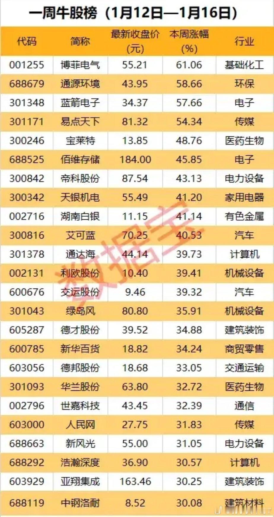 本周牛股榜:15大行业群雄逐鹿 中小盘领涨暗藏轮动玄机本周A股牛股阵营横跨基础化工、环保、电子、传媒等15大行业,个股区间涨幅达到30.08%-61.06%,整体呈现热点分散、轮动提速的鲜明特征。资金布局思路清晰分化,既紧盯业绩兑现明确的细分龙头,也追捧题材催化强劲的弹性标的,中小盘标的成为资金主攻方向。不过部分个股短期涨幅透支预期,需警惕获利盘回吐引发的波动风险。当前市场情绪虽保持活跃,但热点持续性仍有待进一步观察。核心牛股深度拆解1. 博菲电气(基础化工):绝缘材料细分龙头,深度受益新能源产业链需求扩容与产能释放预期,资金关注度居高不下,短期股价强势拉升,后续需警惕获利盘出逃带来的回调压力。2. 通源环境(环保):聚焦土壤修复与固废处理赛道,叠加环保政策加码与项目订单密集落地的双重利好,资金推动下股价弹性凸显,短期上行势头强劲。3. 蓝箭电子(电子):半导体分立器件核心厂商,背靠国产替代浪潮与消费电子行业复苏的东风,技术壁垒构筑竞争优势,叠加行业景气度回升,股价迎来大幅冲高。4. 易点天下(传媒):跨境营销服务龙头,受益出海电商需求爆发与AI营销技术迭代升级,全球化布局价值获资金认可,本周涨幅跻身前列。5. 宝莱特(医药生物):医疗设备领域标杆企业,基层医疗设备更新换代需求攀升叠加海外订单稳步增长,业绩向好预期吸引资金进场,驱动股价大幅走高。6. 佰维存储(电子):国内存储芯片龙头标的,AI算力需求激增带动存储芯片价格上行,叠加国产替代进程加速,资金追捧下股价冲高,短期波动风险加剧。7. 帝科股份(电力设备):光伏银浆核心供应商,依托光伏装机量持续增长与银浆技术迭代红利,产能释放预期叠加行业高景气,成为股价快速上行的核心推手。8. 天银机电(家用电器):家电零部件主业稳健,同时卡位卫星通信赛道,兼具家电出口复苏与商业航天题材双重催化,资金合力推动股价大涨。9. 湖南白银(有色金属):白银冶炼与深加工龙头,受益贵金属价格上行周期与下游需求回暖,业绩弹性获资金关注,短期涨幅十分显著。10. 艾可蓝(汽车):尾气处理装置领军企业,国六标准升级与商用车市场复苏带来增量需求,技术优势叠加订单增长,驱动股价大幅上行。11. 通达海(计算机):司法信息化系统核心服务商,政务信息化政策加码背景下项目订单落地提速,资金追捧带动股价冲高。12. 利欧股份(机械设备):泵业与数字营销双主业并行,同时布局光伏赛道,新能源与数字经济双重题材共振,吸引资金入场推升股价。13. 交运股份(汽车):覆盖汽车零部件与物流运输两大业务,汽车产业链复苏叠加物流需求回暖,业绩改善预期牵引资金进场。14. 绿岛风(机械设备):通风设备细分龙头,基建投资加码与消费升级趋势下产品需求增长,叠加产能释放支撑,推动股价稳步上行。15. 德才股份(建筑装饰):建筑装饰与设计领域龙头,受益地产链修复与城市更新政策红利,订单增长预期强烈,资金追捧下股价大幅上涨。16. 新华百货(商贸零售):区域零售龙头企业,消费复苏带动线下客流回暖,叠加国企改革预期催化,资金推动股价冲高。17. 德邦股份(交通运输):快递物流核心企业,电商旺季带动物流需求增长,叠加快递价格企稳回升,业绩改善预期吸引资金布局。18. 华兰股份(医药生物):药用胶塞领域龙头,疫苗需求增长与国产替代加速背景下,技术优势叠加产能释放,驱动股价持续上行。19. 嘉寓科技(建筑装饰):聚焦光伏幕墙与节能门窗赛道,光伏建筑一体化政策东风加持,订单增长预期带动资金追捧,股价迎来大涨。20. 世嘉科技(通信):通信铁塔与基站设备核心供应商,5G建设复苏与算力基建需求增长双轮驱动,技术优势叠加订单落地,推动股价上行。21. 人民网(传媒):主流媒体龙头,AI+传媒题材催化叠加内容生态升级,政策支持与资金关注共振,助力股价大幅上涨。22. 新风光(电力设备):储能与SVG设备龙头企业,新型电力系统建设提速带动储能需求爆发,技术优势叠加订单落地,驱动股价走高。23. 渝瀚深度(电力设备):电力工程与设备领域核心厂商,电网投资加码与新能源基建推进带来增量订单,业绩增长预期吸引资金进场。24. 亚翔集成(建筑装饰):洁净室工程龙头企业,半导体与光伏产业扩产潮下订单增长强劲,行业高景气支撑股价上行。25. 中钢洛耐(建筑材料):耐火材料细分龙头,钢铁行业复苏带动高温材料需求增长,技术优势叠加产能释放,推动股价稳步走高。总结本周牛股榜充分体现出市场资金的多元布局思路,新能源、半导体等成长赛道的业绩驱动型标的,与商业航天、AI+传媒等题材催化型标的同台竞技,中小盘标的凭借高弹性成为资金主攻方向。不过需要注意的是,部分个股短期涨幅已显著透支基本面,后续需重点跟踪业绩验证情况与题材持续性。对于投资者而言,建议紧跟板块轮动节奏,优先布局业绩支撑扎实+题材催化明确的标的,同时警惕短期涨幅过高个股的回调风险。