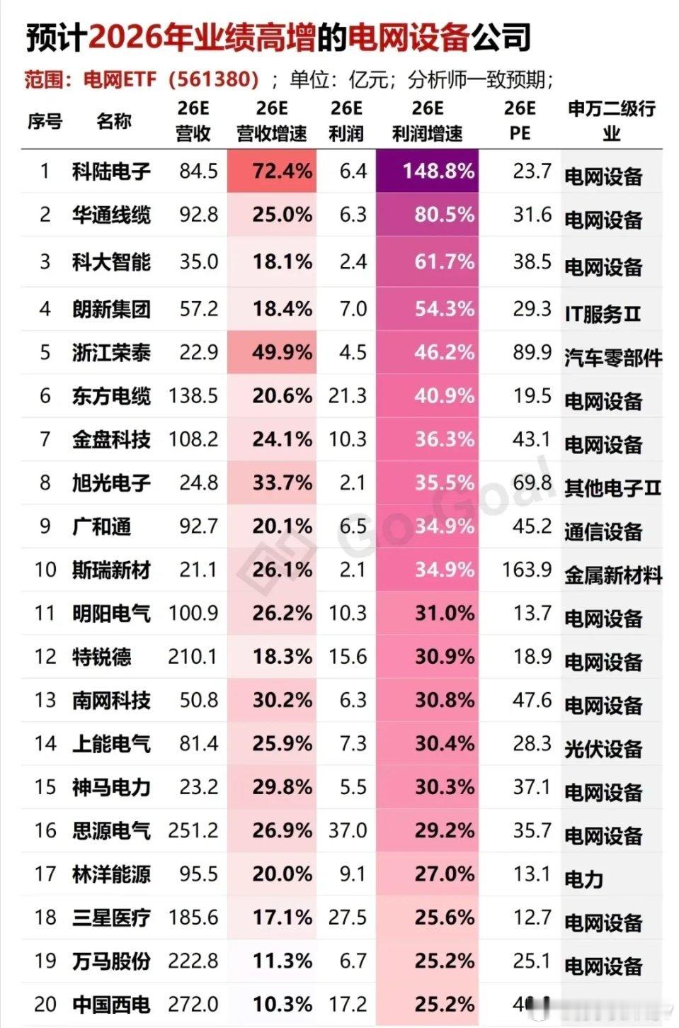 2026电网板块业绩高增:4万亿投资+政策共振,双线布局价值机遇2026年作为“十五五”规划开局之年,电网板块迎来政策与产业的双重爆发期。国家电网4万亿固定资产投资(较“十四五”激增40%)落地,叠加首批新型电力系统试点名单公布、特高压核准提速等利好,储能、特高压、电网数字化等核心赛道需求全面释放。板块覆盖电网设备、IT服务、核心材料等全产业链,业绩高增标的普遍兼具政策催化与订单支撑,低估值龙头与高弹性细分标的共同构成投资主线。核心高增标的深度解析1. 科陆电子:2026年预期营收84.5亿元(+72.4%)、利润6.4亿元(+148.8%),PE23.7。作为电网设备核心标的,深度受益于储能与智能电网需求爆发,业绩弹性在板块中居前,当前估值处于低位区间,性价比优势显著。2. 华通线缆:预期营收92.8亿元(+25.0%)、利润6.3亿元(+80.5%),PE31.6。聚焦特高压与海上风电特种线缆,精准契合“西电东送”与海风装机复苏趋势,利润增速亮眼且估值合理,业绩增长确定性较强。3. 科大智能:预期营收35.0亿元(+18.1%)、利润2.4亿元(+61.7%),PE38.5。深耕智能电网与工业机器人领域,技术积累深厚,利润增速显著领先营收,但估值略高于板块均值,需重点跟踪订单落地节奏。4. 朗新集团:预期营收57.2亿元(+18.4%)、利润7.0亿元(+54.3%),PE29.3。为电网提供数字化解决方案,契合电网智能化升级主线,利润增速强劲且估值具备吸引力,受益于“聪明电网”建设提速。5. 浙江荣泰:预期营收22.9亿元(+49.9%)、利润4.5亿元(+46.2%),PE89.9。布局电网核心材料赛道,实现营收与利润双高增,但当前估值偏高,需持续跟踪业绩持续性与行业竞争格局变化。6. 东方电缆:预期营收138.5亿元(+20.6%)、利润21.3亿元(+40.9%),PE19.5。海上风电线缆绝对龙头,受益于海风装机量复苏与海外电网改造需求,利润规模居板块前列,估值处于低位,安全边际充足。7. 金盘科技:预期营收108.2亿元(+24.1%)、利润10.3亿元(+36.3%),PE43.1。主营干式变压器核心设备,深度绑定储能与特高压建设,利润增速稳健,但估值略高,需关注产能释放进度与技术迭代情况。8. 旭光电子:预期营收24.8亿元(+33.7%)、利润2.1亿元(+35.5%),PE69.8。聚焦电网真空开关设备,受益于电网升级换代需求,营收与利润同步增长,但估值处于高位,需跟踪技术迭代与市场份额变化。9. 广和通:预期营收92.7亿元(+20.1%)、利润6.5亿元(+34.9%),PE45.2。为电网提供通信模组核心部件,契合电网数字化转型趋势,利润增速稳定且估值合理,受益于“源网荷储”协同互动建设。10. 斯瑞新材:预期营收21.1亿元(+26.1%)、利润2.1亿元(+34.9%),PE163.9。供应电网铜合金关键材料,利润增速亮眼,但估值极高,需警惕估值回调风险,重点关注产品技术壁垒与下游需求匹配度。11. 明阳电气:预期营收100.9亿元(+26.2%)、利润10.3亿元(+31.0%),PE13.7。主营变压器等核心设备,直接受益于4万亿电网投资加码,估值处于板块低位,具备强安全边际。12. 特锐德:预期营收210.1亿元(+18.3%)、利润15.6亿元(+30.9%),PE18.9。布局充电桩与储能双赛道,契合新基建与新能源需求爆发趋势,利润规模大且估值合理,业绩增长确定性强。13. 南网科技:预期营收50.8亿元(+30.2%)、利润6.3亿元(+30.8%),PE47.6。聚焦电网节能与储能核心领域,营收增速领先板块,利润增长稳健,但估值略高,需关注政策催化与项目落地节奏。14. 上能电气:预期营收81.4亿元(+25.9%)、利润7.3亿元(+30.4%),PE28.3。布局电网储能变流器核心部件,深度受益于新型电力系统建设,利润增速稳定且估值合理,契合“长时+短时”储能体系布局。15. 神马电力:预期营收23.2亿元(+29.8%)、利润5.5亿元(+30.3%),PE37.1。主营特高压与海上风电绝缘材料,受益于跨区输电通道建设,营收与利润双增,估值适中,具备攻守兼备属性。16. 思源电气:预期营收251.2亿元(+26.9%)、利润37.0亿元(+29.2%),PE35.7。主营高压开关与储能设备,利润规模居板块前列,估值合理且订单储备充足,业绩增长确定性强,受益于输变电设备量价齐升。17. 林洋能源:预期营收95.5亿元(+20.0%)、利润9.1亿元(+27.0%),PE13.1。布局智能电表与储能双主线,契合电网智能化与储能需求爆发,估值处于板块低位,安全边际突出。18. 三星医疗:预期营收185.6亿元(+17.1%)、利润27.5亿元(+25.6%),PE12.7。主营智能电表核心设备,同时布局医疗设备业务,利润规模大且估值为板块最低,具备高安全边际与业绩稳定性。19. 万马股份:预期营收222.8亿元(+11.3%)、利润6.7亿元(+25.2%),PE25.1。覆盖线缆与充电桩业务,营收增速平稳,利润增长稳健且估值合理,受益于充电基础设施全覆盖建设。20. 中国西电:预期营收272.0亿元(+10.3%)、利润17.2亿元(+25.2%),PE40.0。输变电设备龙头企业,中标国家电网14.47亿元大额订单,受益于特高压扩容,但估值偏高,需关注订单释放与海外拓展进度。总结2026年电网板块核心驱动逻辑清晰,国家电网4万亿投资、新型电力系统试点、特高压核准提速三大政策形成共振,储能、特高压、电网数字化、核心材料四大赛道需求全面爆发。20家高增标的覆盖全产业链,呈现“低估值龙头稳增长+高弹性细分高爆发”的格局。投资者可沿两条主线布局:一是低估值安全边际主线,重点关注三星医疗、林洋能源、明阳电气等估值低于15倍、利润规模大的龙头;二是高弹性成长主线,聚焦科陆电子、华通线缆等利润增速超50%、契合储能/特高压核心需求的标的。同时需跟踪政策落地节奏与订单兑现情况,规避高