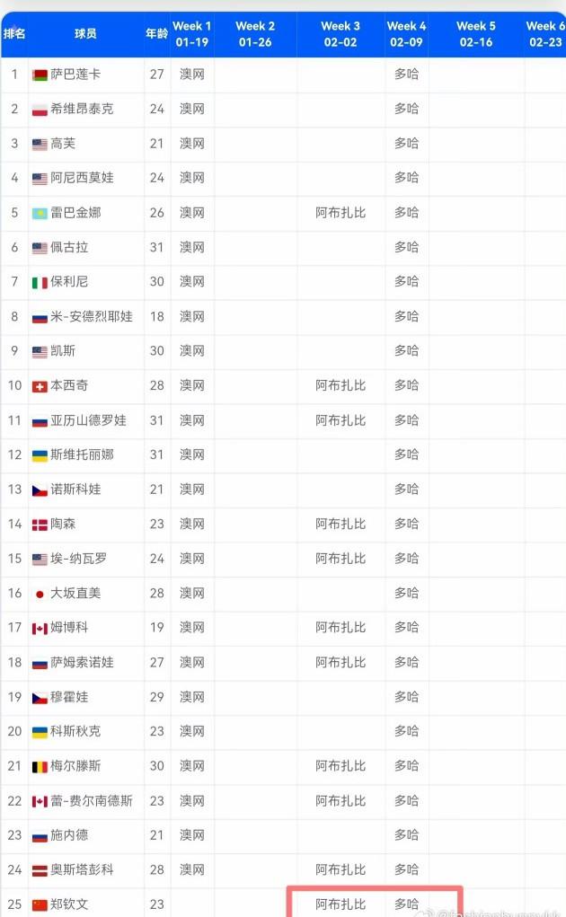 郑钦文已入围2月份阿布扎比、多哈两站比赛,只是那时候她的手肘伤势恢复了吗?不会又要伤退吧? 郑钦文已不年轻了,赛程表里前25名里就有5个比她年轻,还有3个跟她同龄。