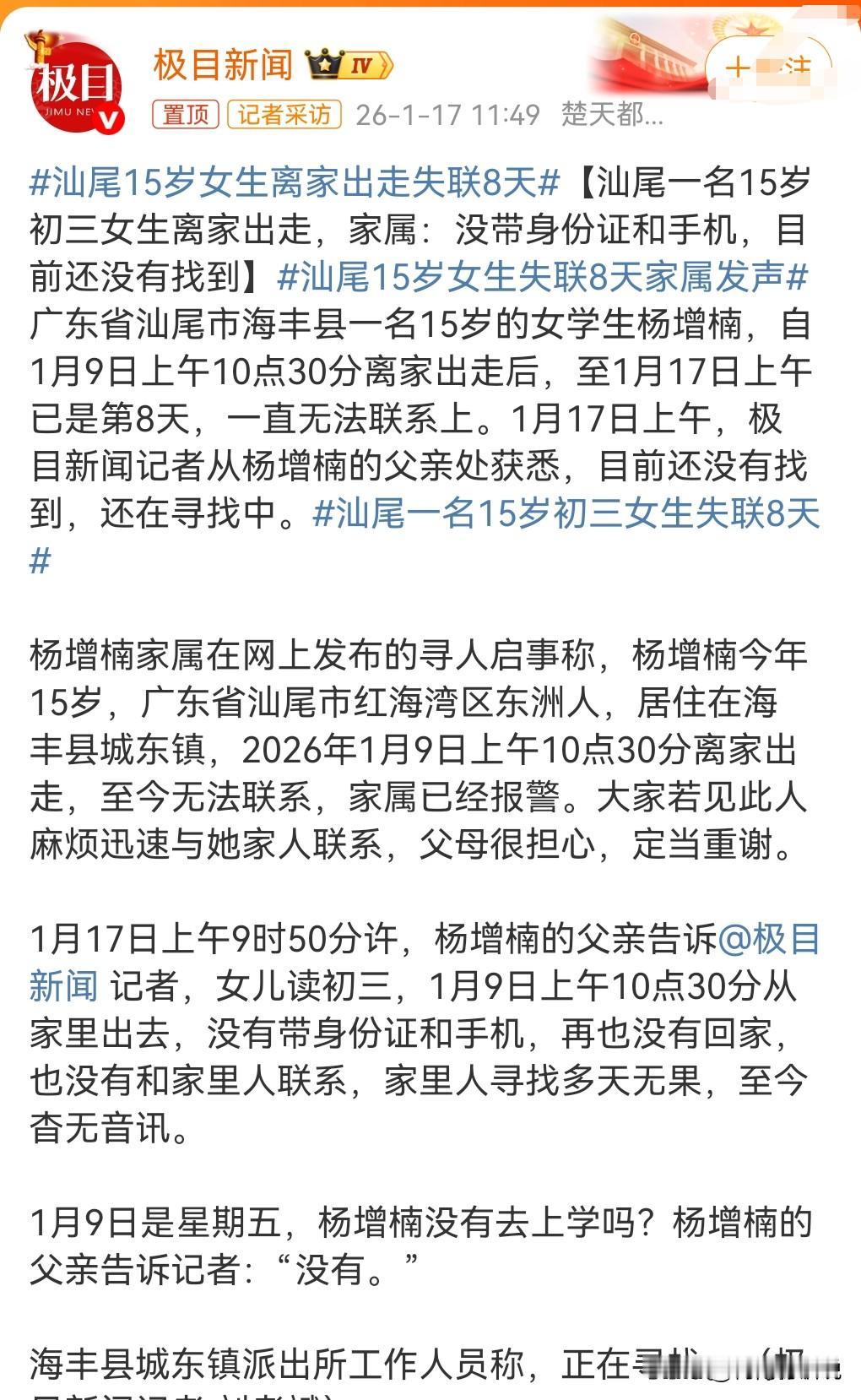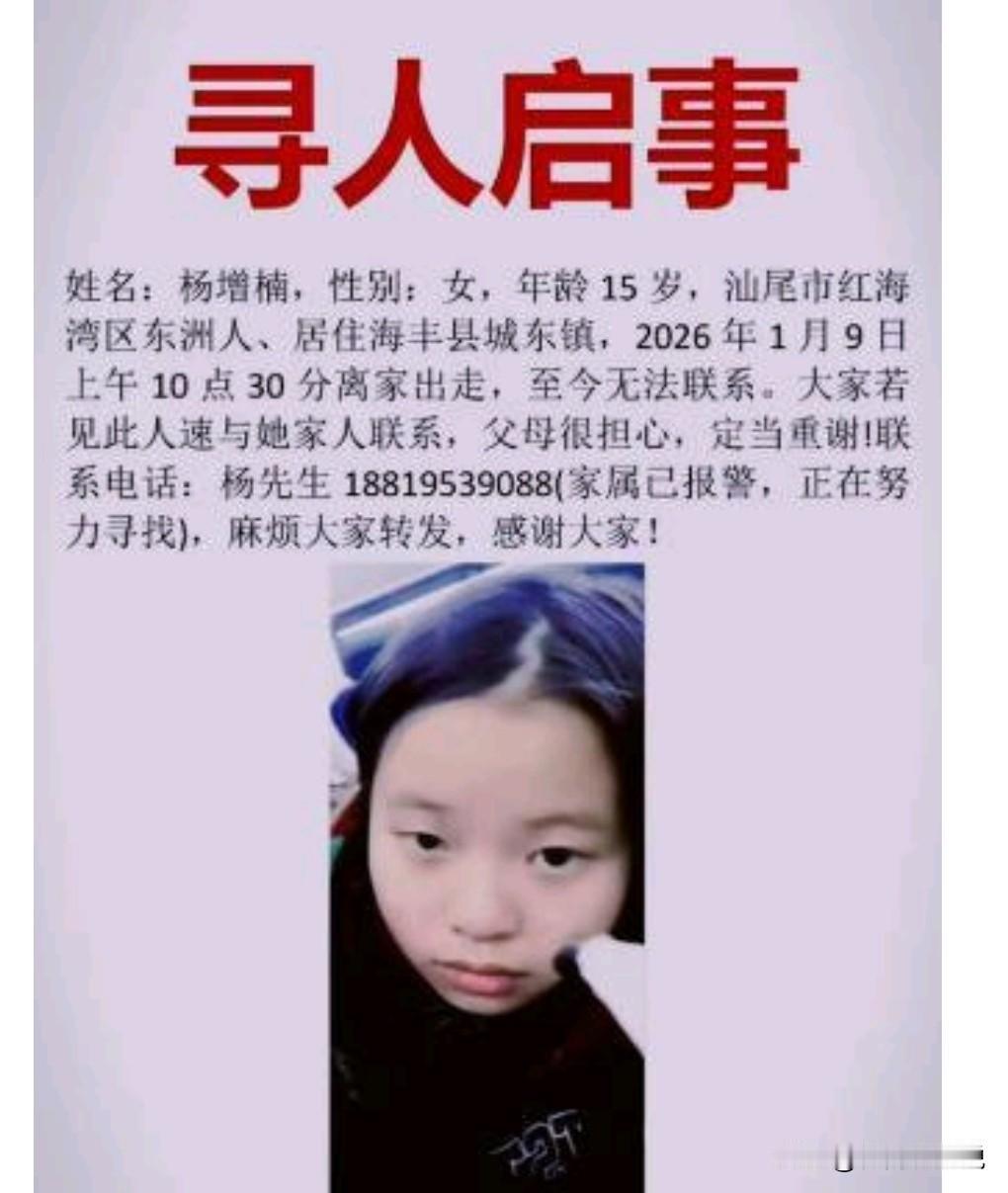 这真是太让家人担心了。 截至1月17日上午,汕尾15岁女生离家出走失联8天。 一个未成年女生竟然失联8天,到底去哪儿了?真是让人非常的担心啊。 希望一切平安啊,一定要早日找到,早日平安的回来呀。 毕竟父母现在非常的痛苦。 这女孩当时没带手机也没带身份证,这也太反常了吧,手机竟然都没带。
