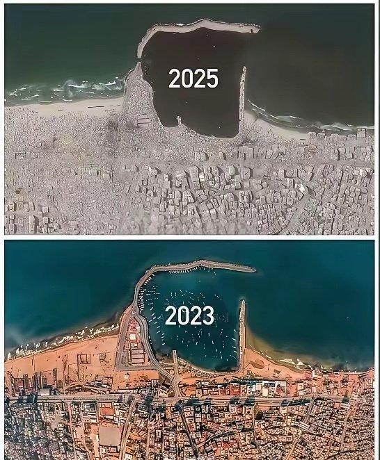 看到这两张高清航拍照片,真的让人感到心碎,战争就是这么残酷。 2023 年的加沙海岸,还有着清晰的城市轮廓、连片的建筑和湛蓝的海水;仅仅两年后的 2025 年,海岸线被大片灰色的废墟覆盖,港口里的海水也变成了暗沉的墨色,曾经的家园只剩下满目疮痍。这哪里是时间的流逝,分明是战争在土地上刻下的伤疤。 当我们在新年里谈论团圆、期许新生时,加沙的人们却在瓦砾中寻找亲人,在断壁残垣里躲避寒冷。战争从不是数字和新闻,它是孩子失去的课堂,是母亲破碎的厨房,是整个城市被生生抹去的温度。 新的一年,愿这片饱经苦难的土地能迎来久违的安宁,愿流离失所的人们能早日回到重建的家园,愿世界上每一个角落都不再有炮火轰鸣,只有孩子们的笑声和万家灯火的温暖。珍爱和平!