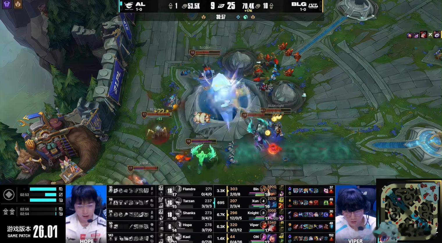 BLG扳平1比1AL,双C领先1w2经济,knight25层杀人数予取予求,伤害溢出了中期就失去悬念,完全没有翻盘希望。BLG对战AL英雄联盟