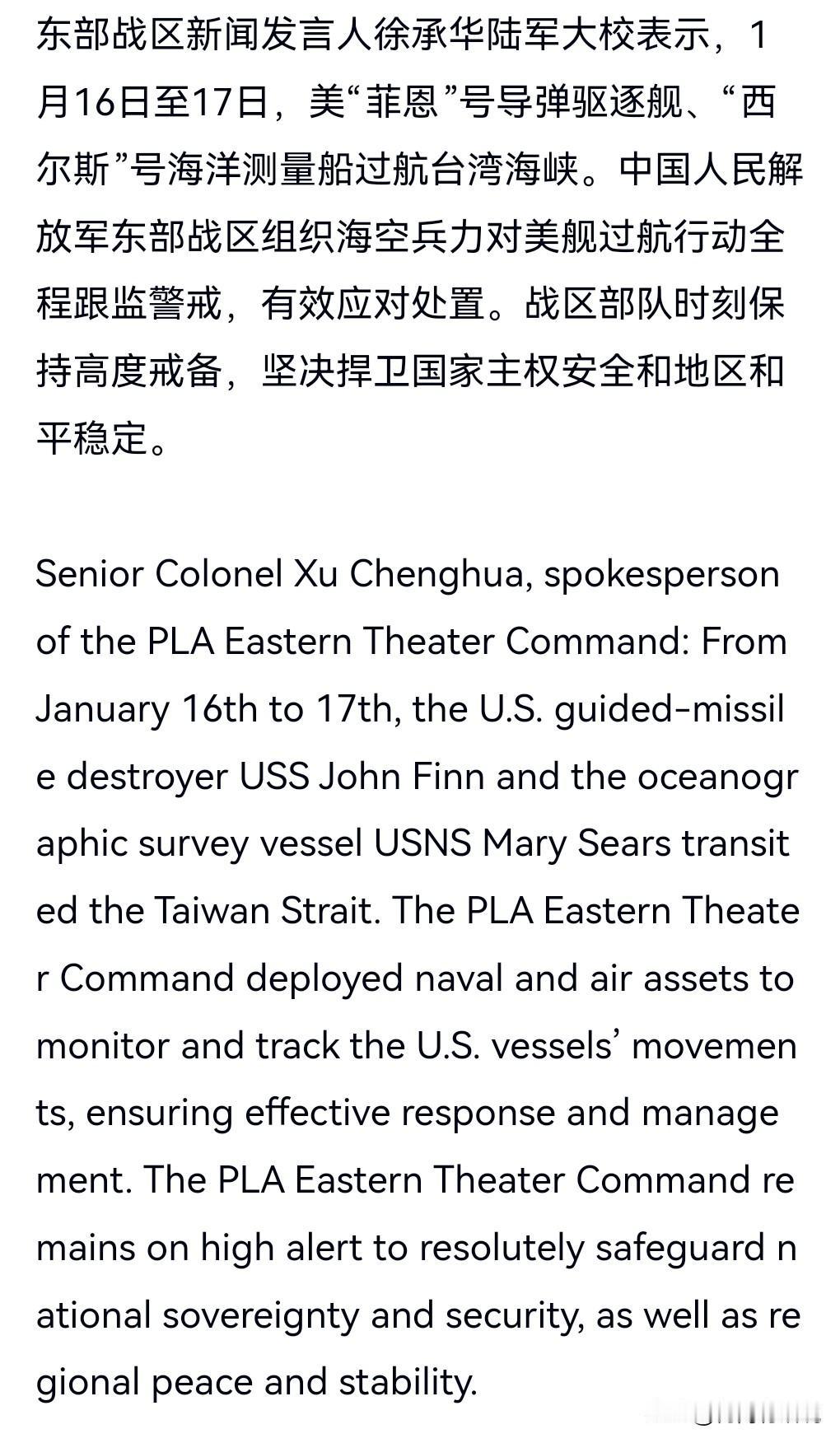 美国这样的国家就是欠收拾,一天到晚到处耀武扬威的,好像全世界都是它家后花园一样,想来就来想走就走。 简直是穷凶极恶,无法无天。 1月16日、17日。美舰、艇过航台湾海峡。 东部战区回应美舰艇过航台湾海峡。 战区部队时刻保持高度戒备,坚决捍卫国家主权安全和地区和平稳定。 这个回应也是相当的给力,美国也不敢在我们的地方放肆,最多也就是逛一下。