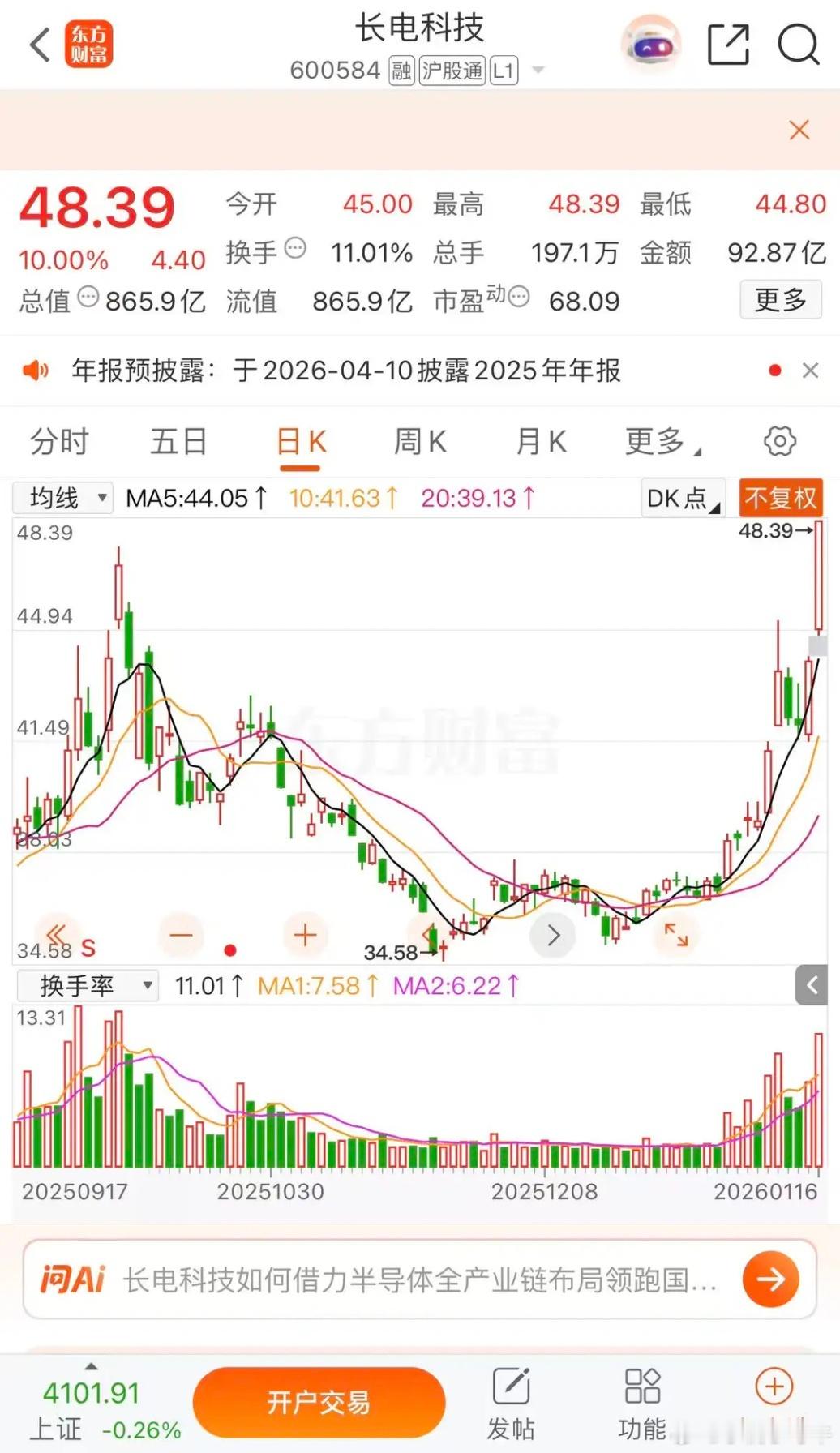 博菲电气未来百元股,长电科技二板涨停,科技股还是主角博菲电气涨停收盘报收55.21元每股,成交金额1.38亿,5连板,3浪了,7连板有机会。长电科技涨停收盘报收48.39元每股,成交金额92.87亿,总市值865.9亿,千亿市值不是梦。近期高点53.43元每股突破就在下周二科技股还是主弦力,把握节奏,今年势必有望5000点。
