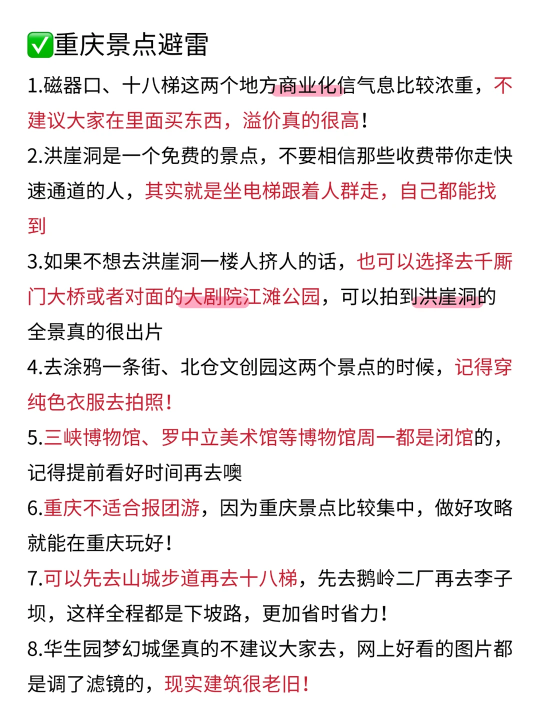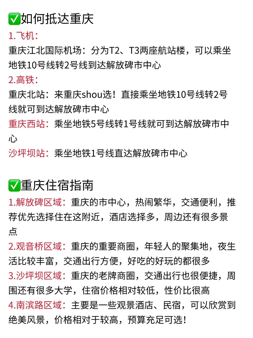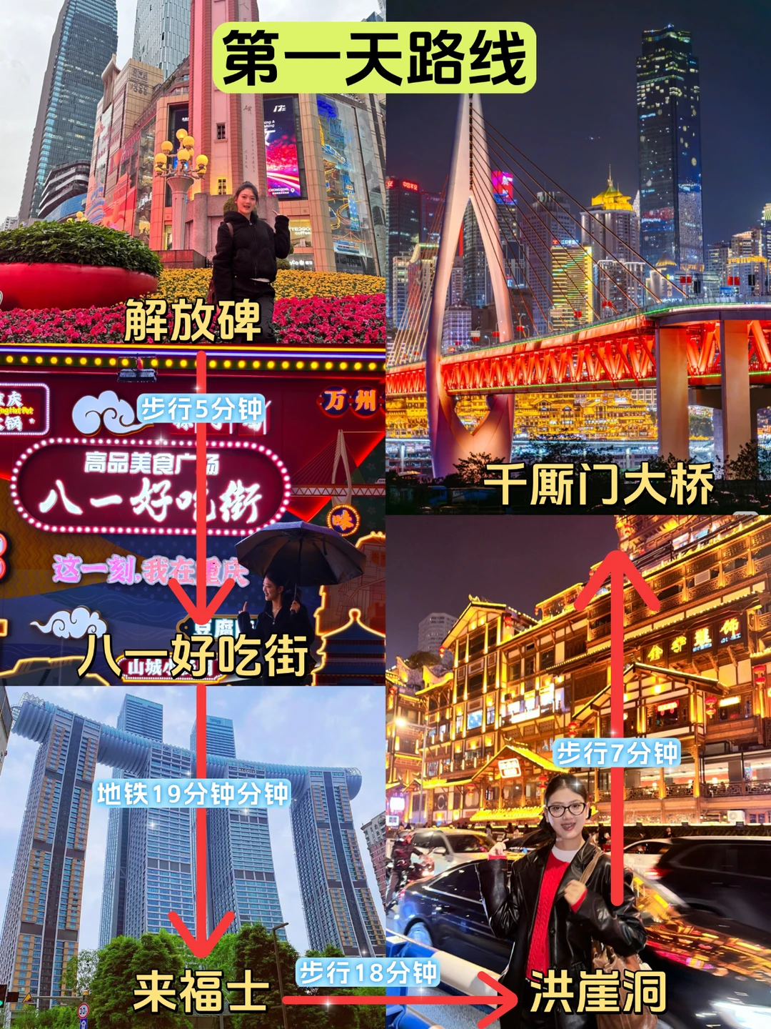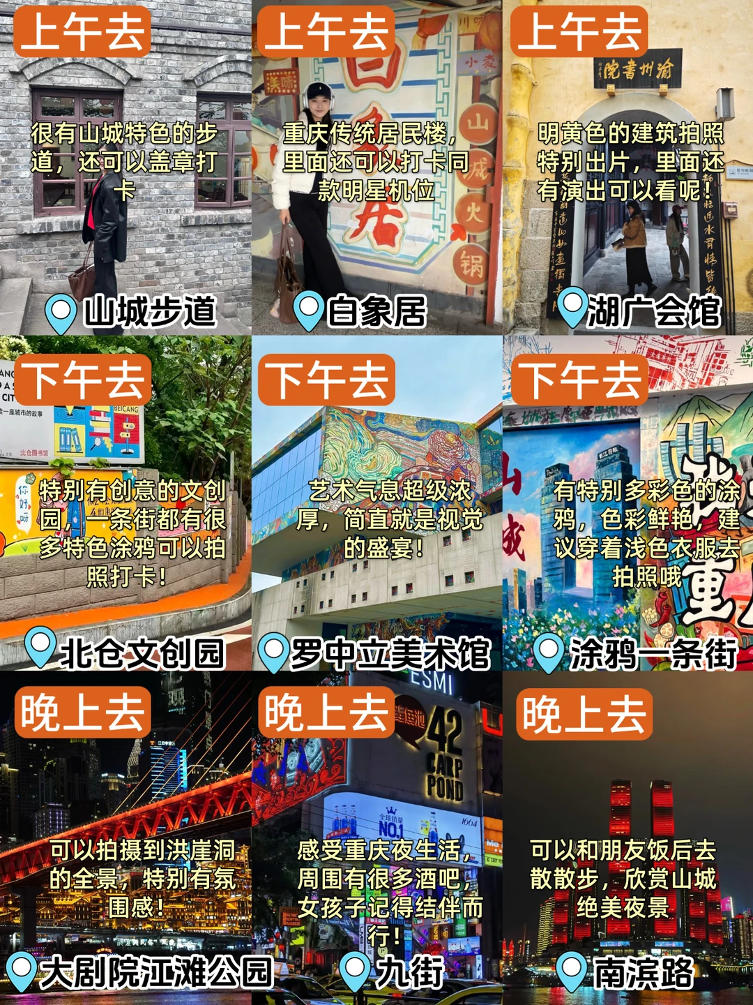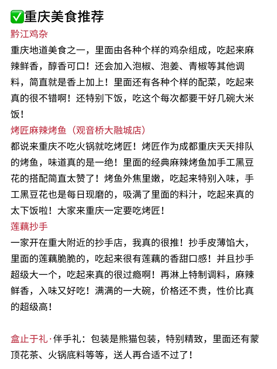 有准备去重庆旅游的姐妹吗?我刚从重庆回来,由于没有做好充足的准备,到了重庆就处处踩坑!😭真的太难受了!回来就熬夜总结出了这份重庆旅游攻略,真的不想大家和我一样的啊☹️!姐妹们赶紧🐴住! - ☀️重庆推荐行程安排 DAY1:解放碑—八一好吃街—来福士—洪崖洞—千厮门大桥 DAY2:山城步道—十八梯—湖广会馆—长江索道—龙门浩老街 DAY3:重庆动物园—鹅岭二厂—李子坝—观音桥—北仓文创园 - 🔥重庆美食:烤匠麻辣烤鱼(观音桥大融城店) - 🎁重庆伴手礼: