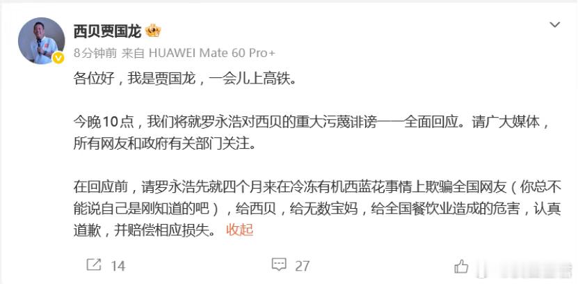贾国龙这次赢麻了贾国龙又发癫了。事实证明,西贝最大的负资产,就是贾国龙那张嘴。1月16日下午17点,贾国龙公开发文,让本已沉寂的“西罗之争”再度炸锅。他预告称,“今晚10点,将就罗永浩对西贝的重大污蔑诽谤全面回应”。他还喊话罗永浩,要求其在回应前,给西贝,给无数宝妈,给全国餐饮业造成的危害,认真道歉,并赔偿损失。说实话,刚看到这个新闻的时候,我嘴角都没忍住抽抽。如果没记错的话,上个月月底,贾老板还对媒体说自己在反思:“如果再选择一次,坚决不硬刚,耐心听每一个顾客的意见。”这才过去了几天,怎么又开始找罗永浩掰扯了?堂堂一个大老板,出尔反尔反复无常,被一颗西兰花刺激的动不动发癫,实在让人费解。更扎心的是啥呢?看他这幅走火入魔的样子,连罗永浩都觉得心酸了,遂发文回应说:“估计是华与华之后,又被什么山寨公关公司忽悠了,我能忍尽量忍吧......”而贾国龙的回应是:“千万别忍,忍不是你性格。”很难想象,都这个当口儿了,贾老板还对网络对骂这么感兴趣。要知道,就在这场事端的前一天,也就是1月15日,有消息称西贝近日初步规划关闭全国 102 家门店,覆盖超 30 个城市。当天下午,贾国龙就在朋友圈发了长文,承认情况属实。他悲壮地说,“遭到铺天盖地的污蔑 125 天,一万七千西贝员工尽力了。”显然,当时的他就已经非常不忿,这种情绪透过文字极端彰显出来,让人感觉几乎到了心理疾病的地步:“我贾国龙不懂公关,我是一个踏踏实实做了 38 年实业,带领一万七千人为顾客做服务的人,我为什么要懂公关?是不是这个世界上不会诡辩的普通人就该被欺辱?”对此,罗永浩也进行了回应。平心而论,罗永浩那张嘴虽然是出了名的刁钻厉害,但对发了疯以后的贾老板,他真的一直都还算温和。回应中,罗永浩有理有据地讲了这么几点——第一,没有一个企业会因为没犯错误,仅仅因为被黑,就能倒闭的。第二,西贝被大家攻击,是在你乱搞开放厨房后失控的,关我什么事?你们的公关劝不住你,只好来求我高抬贵手,我看着你当众自残而不自知,也不好意思再跟你掰扯。第三,如果真担心员工事业,你作为一个有上万名员工的企业家,一开始就不能胡来,为什么当时还说:“我生意可以不做,但官司一定要打!”第四,国家支持发展预制菜工业,是为了让国人吃得更方便卫生,不是为了让餐馆老板用料理煲骗同胞。说来说去还是个知情权的问题。而第五点就比较隐晦了,罗永浩说,虽然自己中途也曾觉得不安全,但老天让这件事借自己的手爆发出来,可能是更好的选择,如果换了别人,可能早就被谭秦东了。谭秦东是谁?某茅药酒事件的主人翁,原是广州医生,8年前因一篇一则批判某茅药酒的文章,被内蒙古警方跨S抓捕。这已是8年前的旧案,咱今天就不说远了。回到贾罗之争来,1月16日当晚,还不到预告的22点,贾国龙就迫不及待的发了针对罗永浩的批判书。这一次,贾老板显然又换了狗头军师,还做了自以为“万全的准备”。他换了一种打法,一上来就揪着这句“可能早就被谭秦东了”,开始给罗永浩扣帽子。他给罗永浩安下的罪名非常沉重,已经绝口不提“侮辱西贝”了,而是“侮辱政府,侮辱司法”。他说,罗永浩两次在网上暗示自己可能被跨S,这就是恶意煽动公共情绪,给他本人,给西贝,给内蒙古都造成了巨大伤害。他还说,从事件发酵到现在,西贝公司从没报过警,只他妻子报过一次警,是因为全家都被人肉了。而在罗永浩制造的网暴里,全国西贝门店服务员被打被逼下跪数十次。最后,他喊话罗永浩,要对方明天跟自己一起去内蒙古自治区政府、内蒙古公安厅,甚至去公安部,去查明真相。 这次贾国龙发布的几篇言论,合在一起看,真的霸道愚昧又可怕,完全彰显了他这种老牌企业家的落后认知和一贯手段。其一,他要求罗永浩道歉的对象,除了西贝,还包括“无数宝妈”和“全国餐饮业”。这就等于,他把消费者里的一个群体和一个庞大的行业拉成了自己的“人质”。潜台词仿佛是:你骂我西贝,就是骂所有辛苦带娃的妈妈,就是骂我们勤勤恳恳的餐饮人。但这逻辑根本站不住脚:难道天下宝妈就必须支持西贝?宝妈们难道没有权利知道,自己花高价买给孩子吃的,到底是现炒的还是预制的?其二,更可怕的是,贾国龙后面更是把“政府部门”也强行与自己绑定,给罗永浩扣上了一顶“煽动舆论,攻击企业经营者和政府部门”的大帽子。说实话,这手段不仅低劣,而且相当不入流,已经完全脱离了“产品与价格”的讨论范畴,上升到了人身攻击和写大字报的层面,似乎已经是想把对方往牢狱里整了。问题是,当地政府部门愿意被这样拉出来“站台”、跟你一起被架在火上烤吗?这到底是谁在煽动舆论?这分明是贾国龙在试图“挟持”公权力来恐吓批评者。回顾整场风波,一个荒诞的事实是:对西贝品牌伤害最大的,不是罗永浩,也不是任何网友,恰恰是创始人贾国龙自己。起初,这只是罗永浩随口的一个吐槽,西贝完全可以冷处理,让事情自然过去。但贾国龙不,他高调宣称“生意不要了也要刚到底”。接着,当罗永浩将话题引向预制菜标准和价格的核心问题时,本可以见招拆招,或者坚持法律途径。但贾国龙不,他主动邀请一堆记者直播后厨,结果“西兰花”等梗全网疯传。再接着,事件在几桩其他新闻的冲刷下本可默默过去。但贾国龙不,他再次跳出来指控罗永浩是“网络