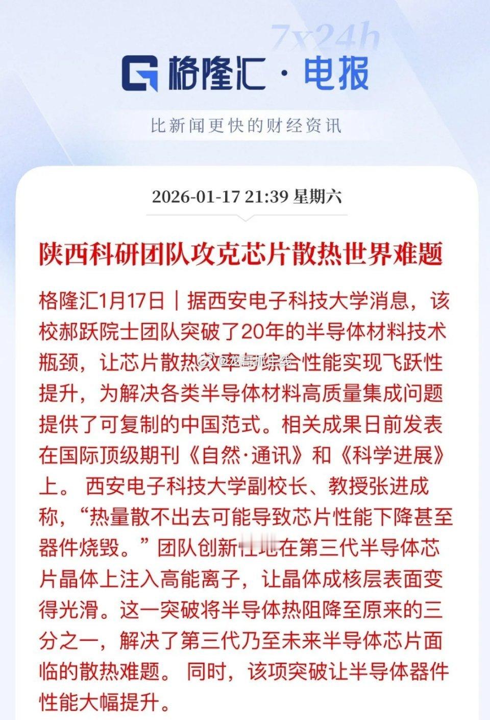 芯片再迎利好,攻克世界性难题,周末半导体科技真是利好一个接着一个,先是英伟达的核心零部件停工了,说明H200进不来了,利好国产替代,然后是我国首台“核心芯片制造设备”串列型高能氢离子注入机成功出束,然后晚上是芯片迎来利好,陕西科研团队攻克芯片散乐世界难题提高半导体元器件性能大幅提升,就怕还得含没喊一句:快来啊,下周半导体产业链要继续上涨了,兄弟姐妹们快进来啊。