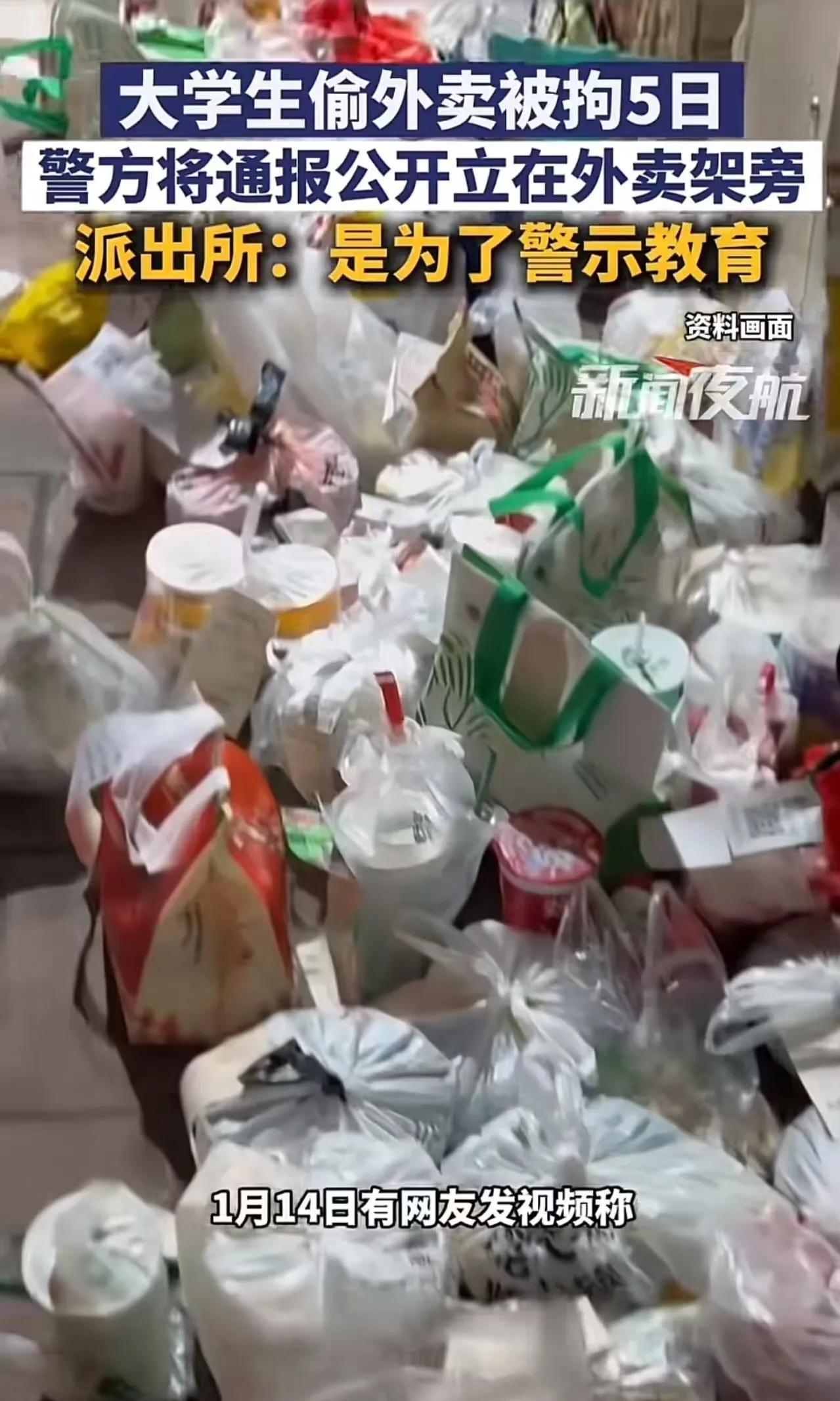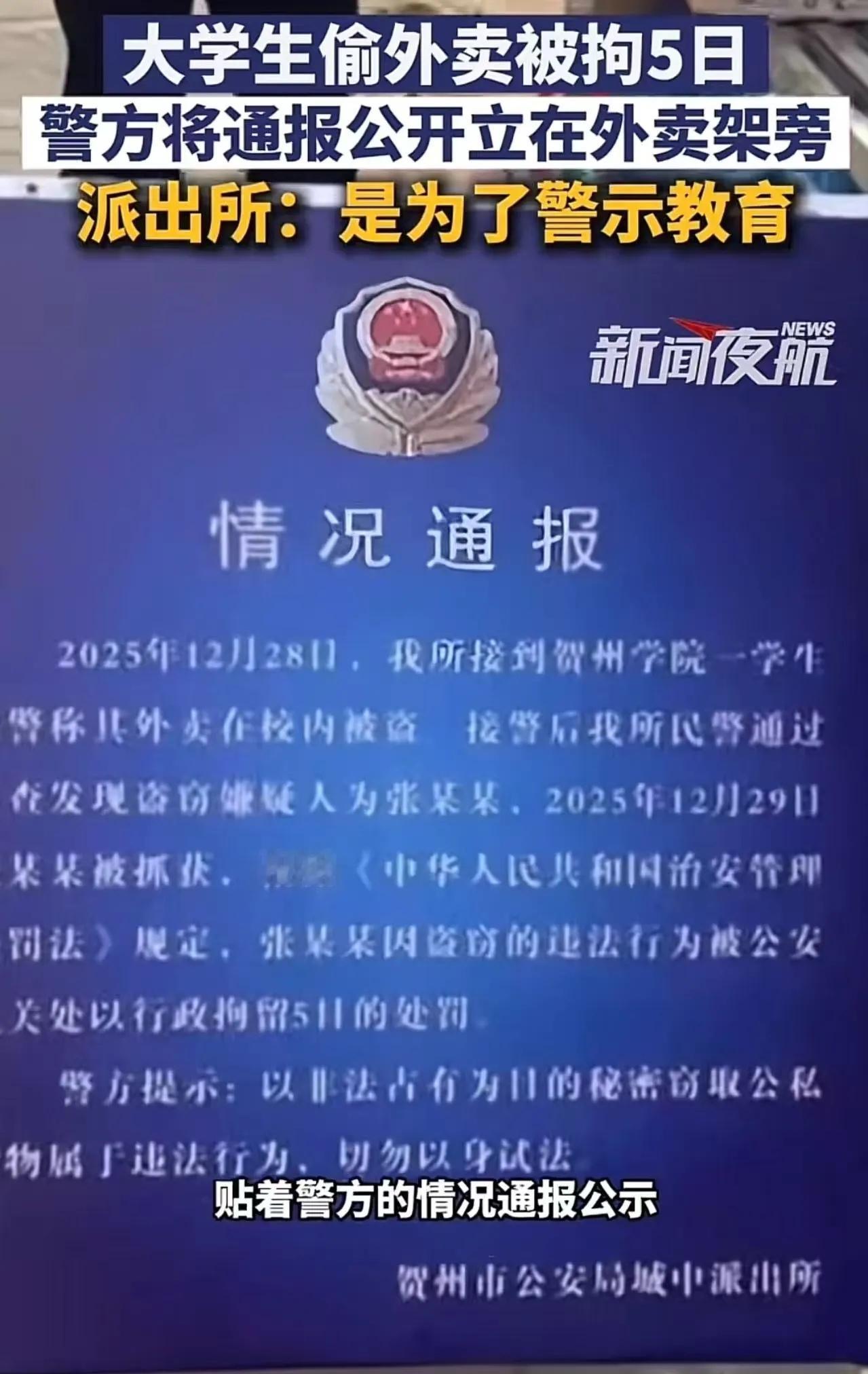 太颠覆认知了!某高校一名大学生,趁宿舍楼下外卖架没人,多次顺手牵羊偷拿别人的外卖,被失主报警后抓了现行。本以为也就是赔点钱、道个歉的事儿,没想到警方直接给了行政拘留5日的处罚,更让人热议的是,派出所居然在校外外卖架旁立了块大牌子,把这事明明白白写出来,说要“震慑小偷”,解决学校外卖屡遭盗窃的难题。 这牌子一立,网友直接吵翻了天!有人心疼不已:“不就几份外卖吗?至于拘留还公开通报?万一这学生是偏远山区来的,靠助学贷款读书,真穷得吃不上饭才犯错,这通报不就是把人往绝路上逼?简直毁了孩子一生!” 也有人怒怼反驳:“别洗白了!大学生都是成年人了,偷东西就是盗窃,跟穷不穷没关系,大概率是把生活费花在游戏上了,就得狠狠罚!年龄不是挡箭牌,学校该直接开除,别浪费教育资源!” 还有人较真法律层面:“偷就是偷,多次盗窃哪怕金额小也是违法,拘留没毛病,但公开通报是不是太过分了?这不是公开羞辱吗?” 其实这事没那么简单,咱们先把法律说清楚。很多人觉得“几十块钱的外卖,怎么就行政拘留了?”但根据《治安管理处罚法》第四十九条,盗窃公私财物就可处5-10日拘留,关键是这学生是“多次盗窃”——盗窃的认定不只是看单次金额,多次作案哪怕金额小,也符合处罚标准,所以行政拘留5日是完全合法的,不是警方“小题大做”。 再说说大家争议的“公开通报”:警方有权对治安处罚案件公开通报,目的是维护公共秩序、警示他人,本身不违法,但前提是不能泄露个人隐私。如果牌子只是说“某在校大学生多次盗窃外卖被拘留”,没暴露姓名、照片、学号,法律上是允许的;可要是把这些关键信息都公开了,就可能侵犯隐私权,那就不妥了。 还有人说“学校该开除”,这里也要明确:行政拘留不等于开除学籍!根据《普通高等学校学生管理规定》,学校可根据情节轻重给纪律处分,但不一定直接开除,得看校规和学生认错态度。 现在争议的核心其实是:“挂牌通报”到底合适吗?支持方觉得,学校长期被外卖失窃困扰,公开通报能“杀一儆百”,让其他人不敢再犯,成年人要为自己的行为负责,这不是“毁一生”,而是让他记住教训;反对方则认为,就算违法,也该先搞清楚原因,要是真家境贫寒,公开通报就是“社会性处死”,让他在同学面前抬不起头,可能破罐子破摔,违背了教育的温度。 说实话,偷外卖该罚,这是底线!侵犯别人财产权,多次盗窃挑战规则,不处罚就是纵容,对遵纪守法的学生不公平。但“挂牌通报”的方式真的有待商榷,教育的本质是“治病救人”,不是“羞辱示众”。 其实完全有更好的办法:私下批评教育、让他赔偿失主损失、写保证书;要是真家境困难,学校可以启动帮扶机制,给助学金、勤工俭学岗位,从根源上解决问题,而不是简单粗暴地把人推向对立面。 真正的法治精神,是维护规则的同时给人改过自新的机会;真正的教育,是坚守底线的同时保留人性的温度。 你支持“挂牌通报”吗?如果是你被偷外卖,觉得这种震慑方式有用么?要是犯错学生的家长,你能接受孩子被公开通报么?法律要讲原则,教育要讲温度,两者该怎么平衡?欢迎在评论区留下你的观点! 来源:综合自网络新闻报道及警方通报