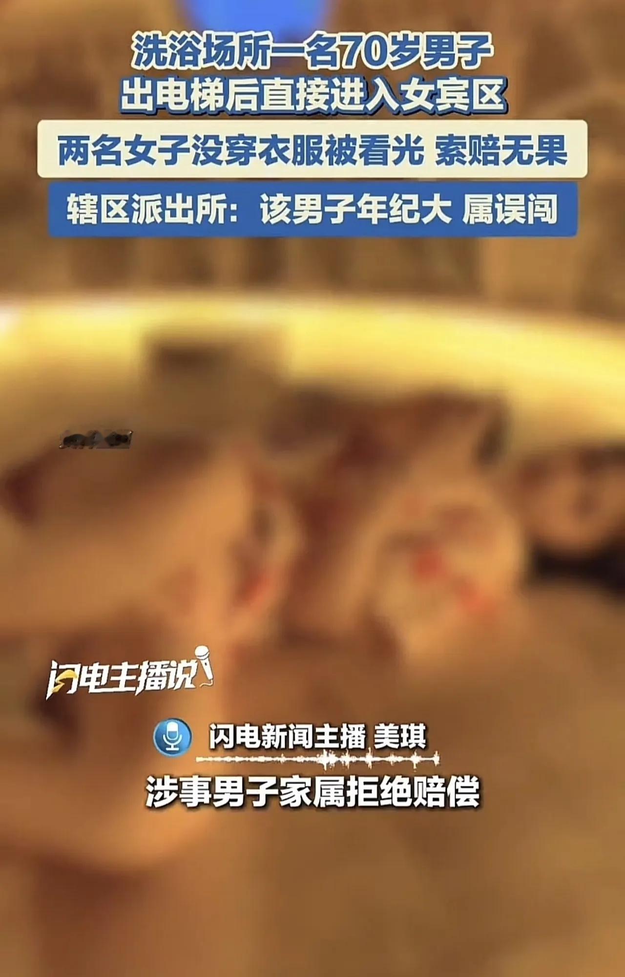 “70岁老人眼花走错,凭啥要赔偿?”吉林这起洗浴中心风波,真的让人气不打一处来! 关女士和朋友兴冲冲去洗浴中心放松,洗完澡正光着身子在更衣室准备穿衣,突然一个陌生男子推门就闯进了女浴室,还直直看了她俩一眼才转身离开。 这一下可把两人吓得够呛,又羞又气,隐私被当众看光,换谁都没法接受!穿好衣服后,关女士立马找洗浴中心讨说法,还直接报了警。 洗浴中心调了监控,画面里显示男子从电梯出来后,直奔女浴室,之后快速退出,看着确实像走错了。可关女士觉得,不管是故意还是误入,自己受了委屈,就得要个说法,于是提出让洗浴中心和涉事男子赔偿。 没成想,索赔直接被双重拒绝!洗浴中心一口咬定自己没责任,涉事男子的家属更是理直气壮,说老人都70多岁了,年纪大眼花,走错浴室太正常了,没必要揪着不放。 警方调查后,也认定男子是误入女浴室,并非故意偷窥,可这样的结果,关女士根本没法认同。 其实这事里,法律上的责任边界很清晰,可不是一句“走错了”“年纪大”就能免责的! 首先洗浴中心肯定跑不了责任,《民法典》明确规定,经营场所必须尽到安全保障义务,洗浴中心得在显眼处设清晰的男女浴室提示牌,必要时还要有工作人员引导,男子能轻松闯进女浴室,明显是管理有漏洞,没尽到该尽的义务,自然要承担赔偿责任。 再说说这位70岁的老人,虽然《治安管理处罚法》里提到,70周岁以上违反治安管理,即便该拘留也不执行,但这只针对行政处罚,民事责任一点都不能少! 老人只要精神正常,就是完全民事行为能力人,女浴室门口都有明确标识,他没看清闯入,本身就有过失,侵犯了别人的隐私权,就该赔礼道歉,甚至承担相应的精神损失赔偿,家属拿年纪大当挡箭牌,在法律上根本站不住脚。 现在关女士的维权路还没个结果,这事也引发了不少讨论,有人说老人不是故意的,赔个不是就行,没必要要赔偿;也有人怒怼,年纪大不是免罪金牌,隐私受侵犯就该维权;还有人反问,要是换成女性走错男浴室,家属还能这么硬气不赔偿吗? 你觉得关女士索赔过分吗?70岁老人误入该担民事责任吗?洗浴中心的责任是不是最大?欢迎评论区聊聊~ 来源:综合自网络新闻报道及法律公开条文