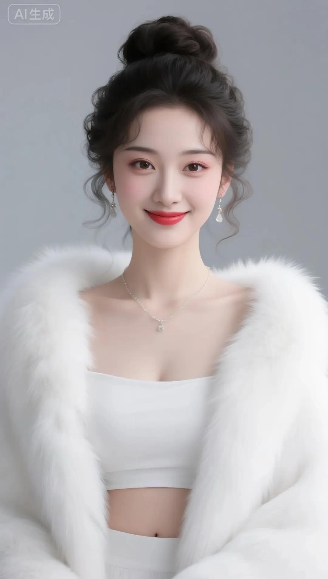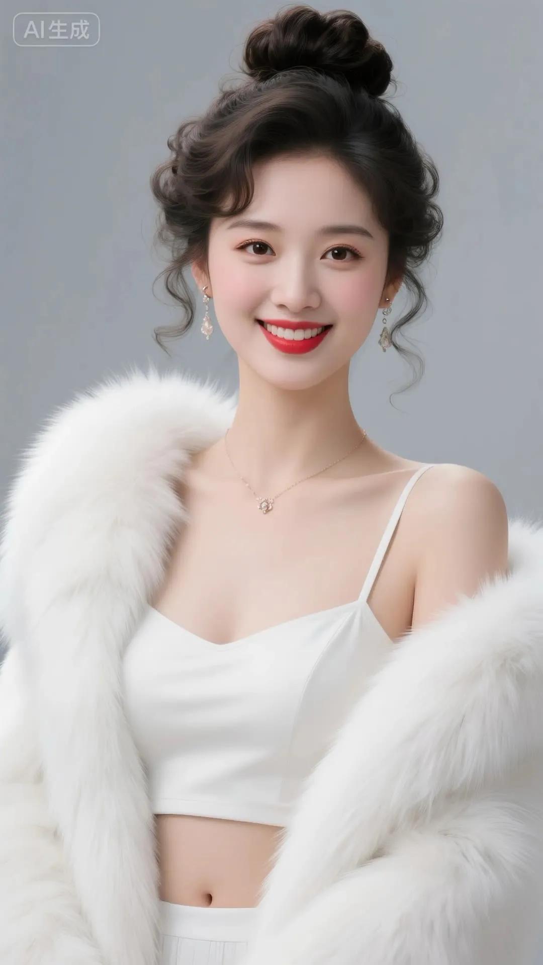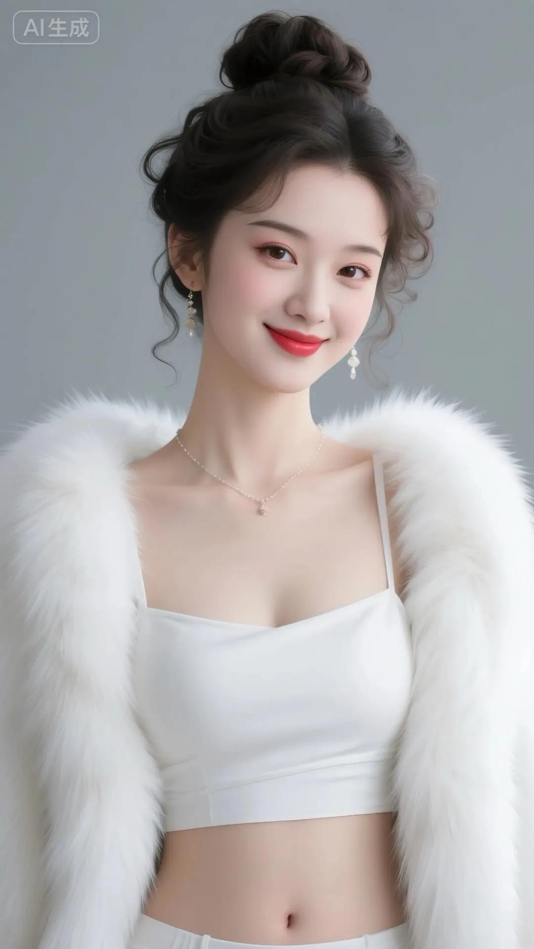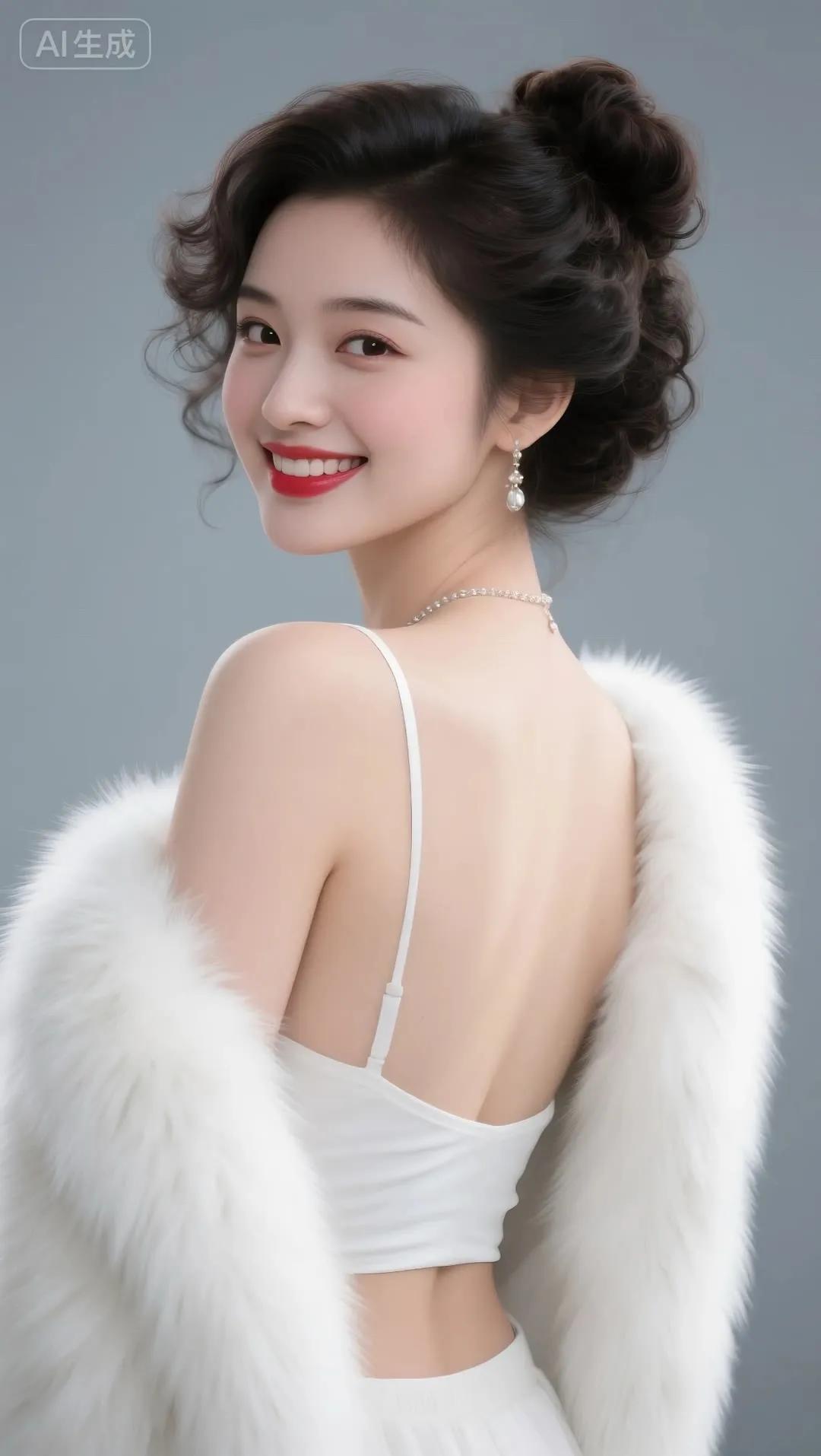 优雅白裙搭配毛绒外套,甜美笑容,尽显温柔气质!