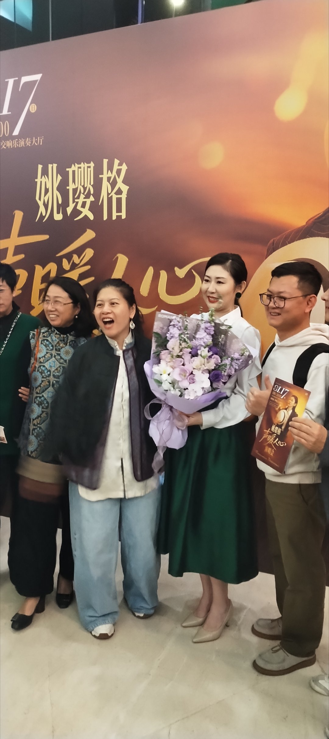 2026年一月十七号姚樱格老师在中国广东省广州海珠区二沙岛星海音乐厅演出结束在大堂演出完毕后与他们粉丝合影过留念——香港著名殿堂级徐小凤为他:“送花篮”MusicFM音乐之声央视6公主蓝羽中国香港
