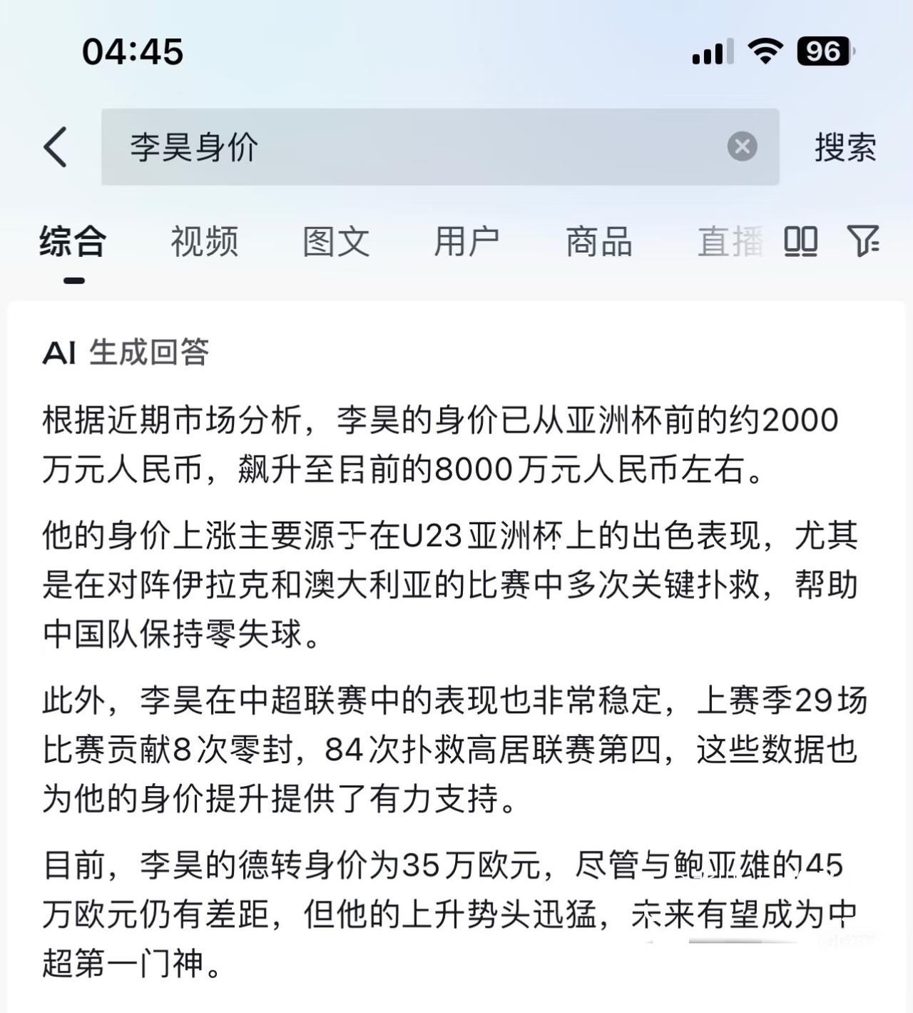 李昊身价8000万? 目前这更像是俱乐部的标价,德转市场上他的估值远没到这个数,1200万欧更是有点夸张。虽说他在比赛里表现不错,但对手强度和铁桶阵的情况,多少影响了对他真实实力的判断。